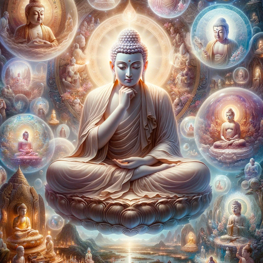 Maitreya, seated in a meditative posture, surrounded by a radiant aura. Visions of past Buddhas and ethereal realms float around him, representing his introspection about the Lord’s miracles and his decision to seek answers from Mañjuśrī.