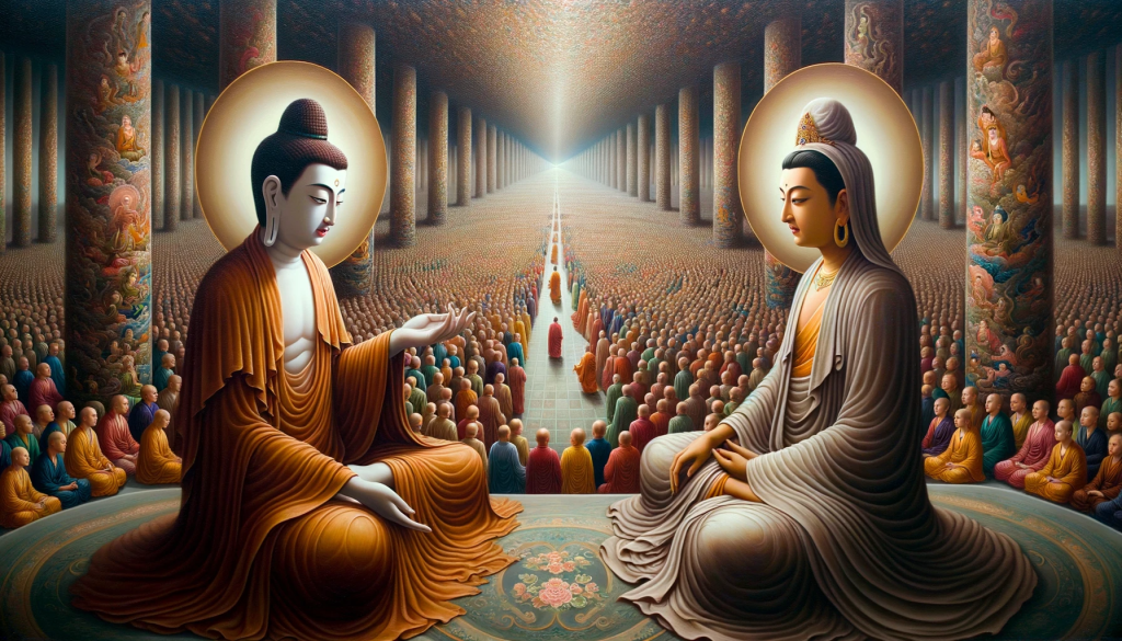 Maitreya, with a look of reverence and determination, approaches Mañjuśrī, who exudes wisdom and serenity. The background showcases the vast assembly, symbolizing the anticipation of the sacred encounter between the two great Bodhisattvas.
