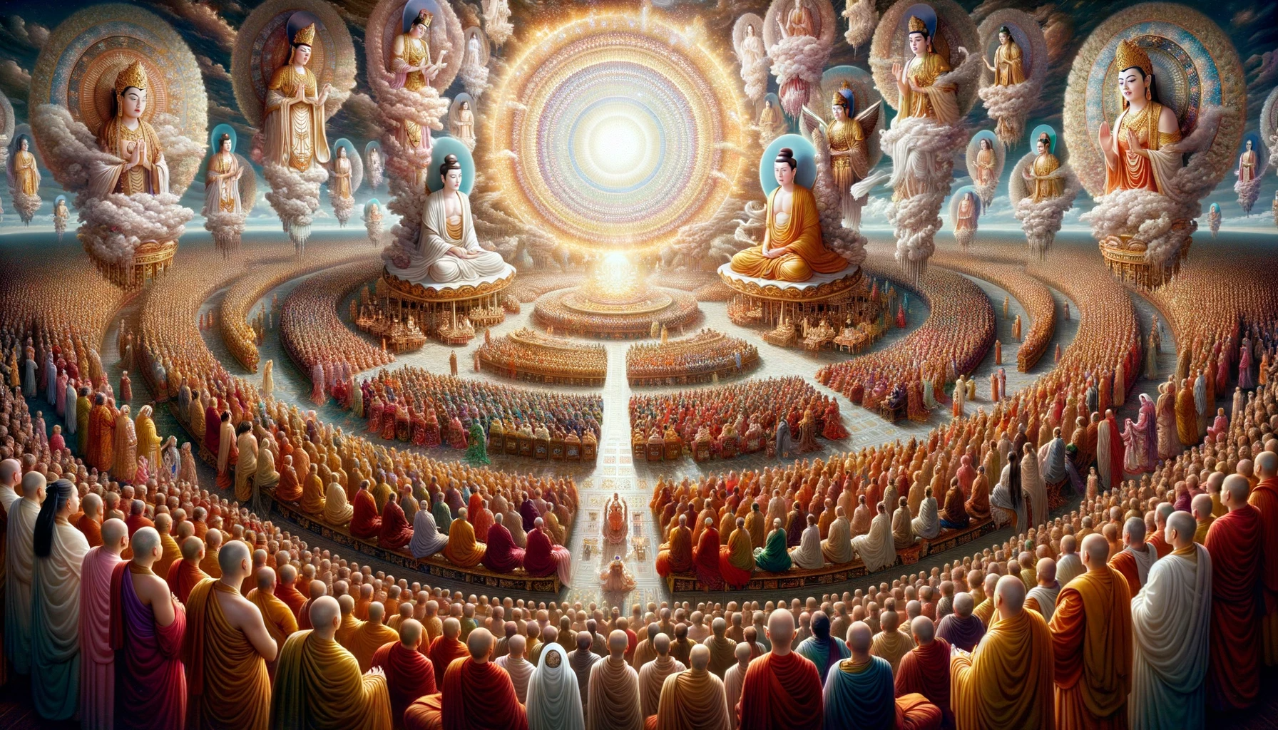 A panoramic view capturing the diverse assembly of monks, nuns, celestial beings, and other figures, all in awe of the Lord’s miracle. Their faces reflect wonder, astonishment, and a shared thirst for understanding, with the radiant spectacle of the Tathāgata’s power in the backdrop.