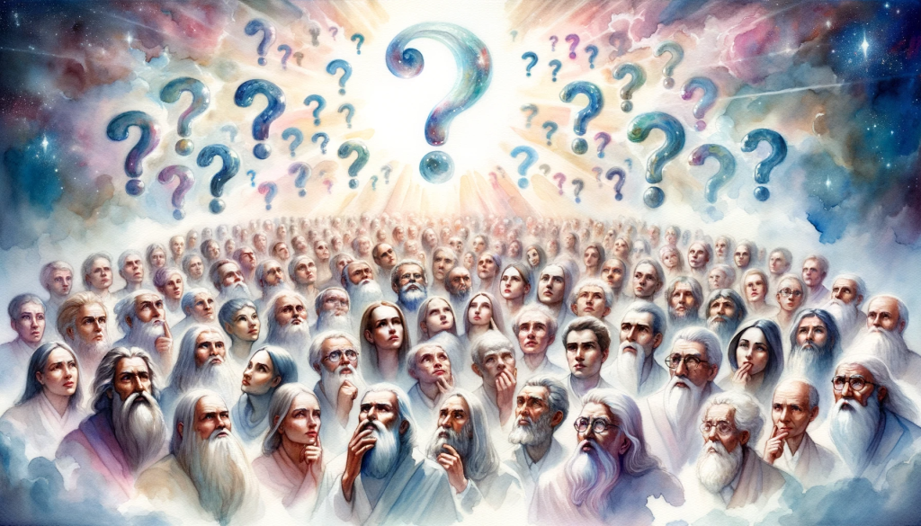 Close-ups of various beings from the assembly, each with a thoughtful and introspective expression. Their collective gaze is directed towards a luminous source, symbolizing the Lord’s miracle, with question marks and radiant light rays representing their collective quest for enlightenment.