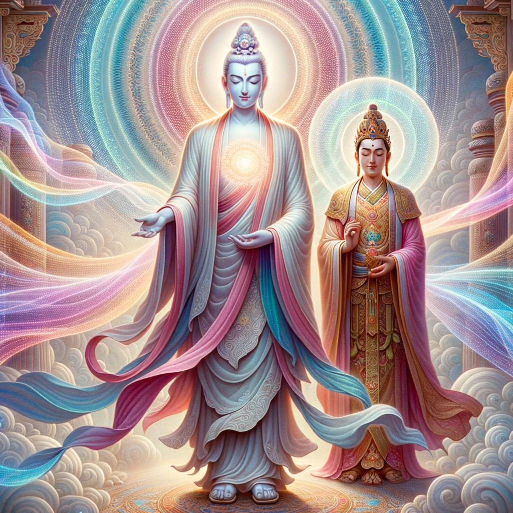 Maitreya, standing tall, with a radiant halo around his head, signifying his profound insight. Ethereal waves emanate from him, symbolizing his perception of the thoughts of the entire assembly. Mañjuśrī stands beside him, ready to impart wisdom.