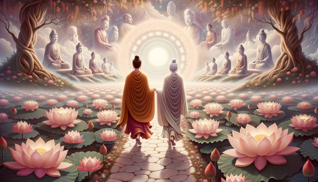 Illustration of Maitreya and Mañjuśrī, journeying together on a pathway, with each step causing lotus flowers to light up. The ethereal atmosphere around them is filled with silhouettes of past Buddhas and spiritual realms, emphasizing their mutual quest for knowledge about the Tathāgata’s miracle.