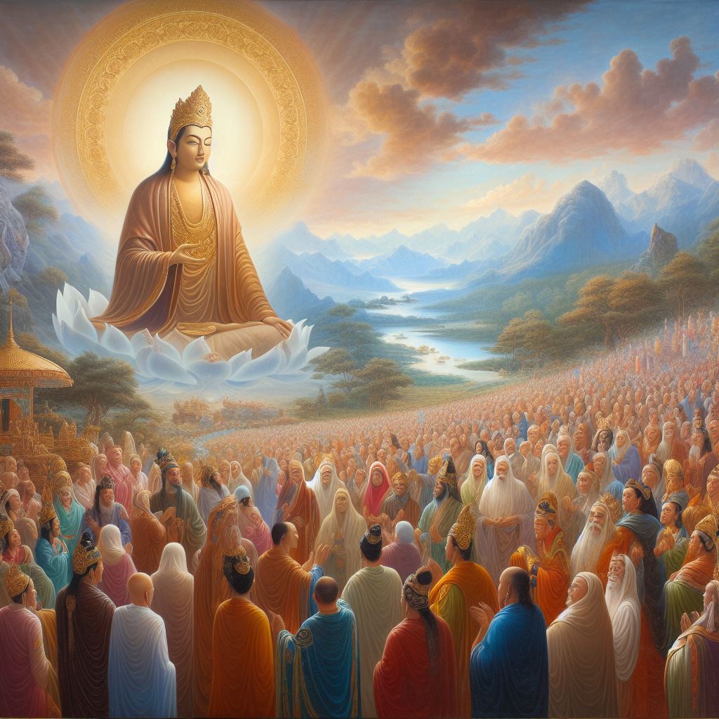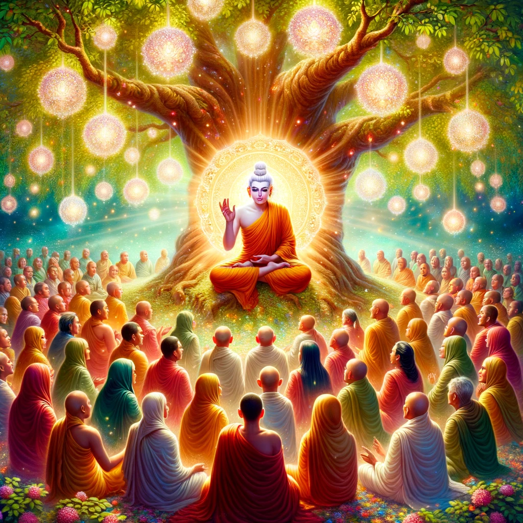 With eyes full of wonder, the crowd stood ready, eager to receive the Tathāgata’s wisdom. They knew something incredible was about to happen, and they couldn’t wait to soak in the brilliance of his words, shining as brightly as that luminous ray. It was a modern-day miracle, an awe-inspiring foretoken of the profound knowledge to be shared with all.