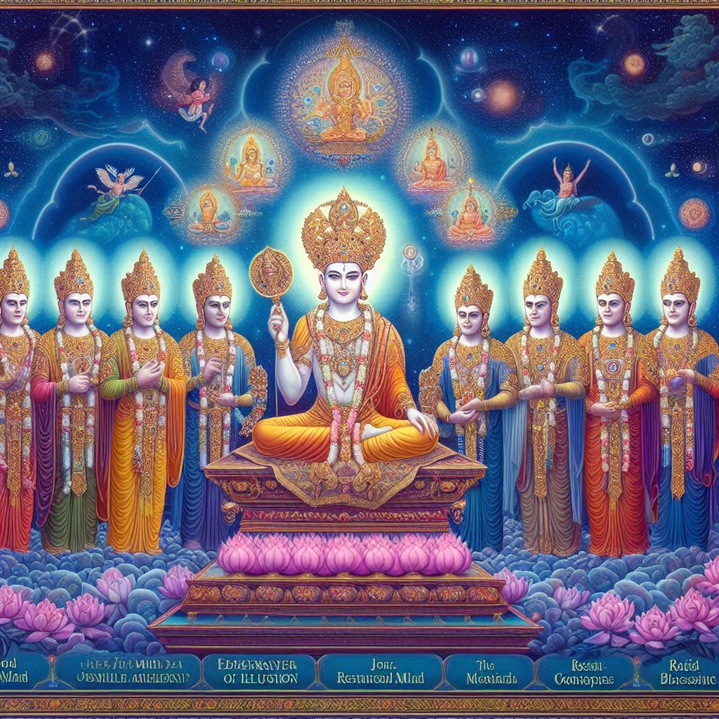Eight young princes, each labeled with their virtues like “Good Mind” or “Destroyer of Illusion.” They stand in a semi-circle, with the Lord Kandrasuryapradipa in the center, symbolizing their devotion and shared journey.