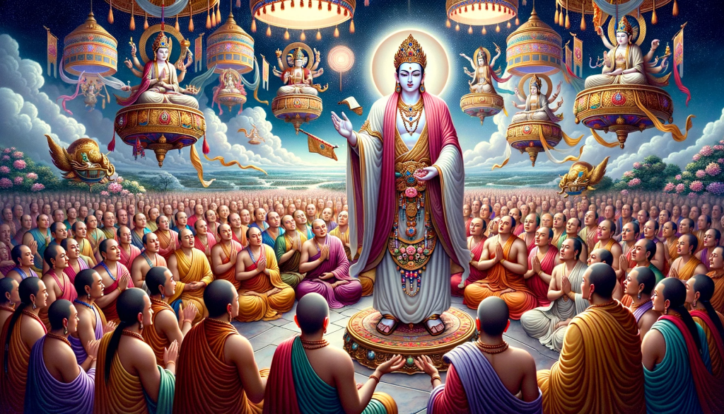 The grand assembly, with Mañjuśrī in the forefront, looking onward with hope and anticipation, symbolizing the collective eagerness to receive the teachings of the ‘Lotus of the True Law.’