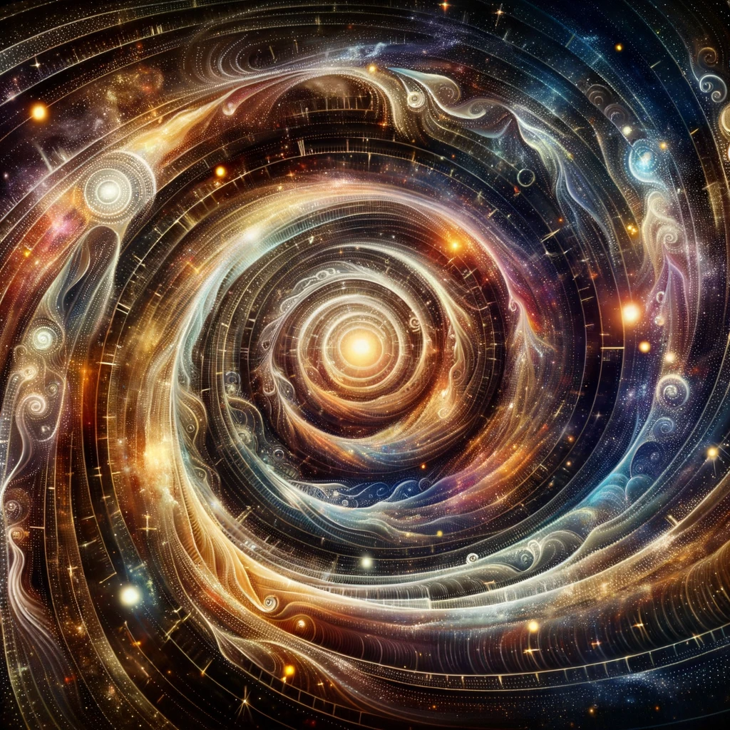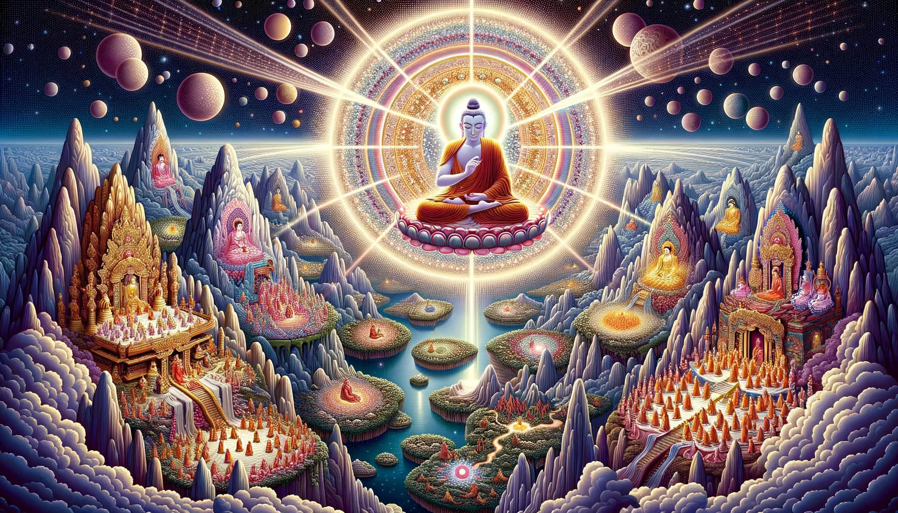 An artistic representation of time’s flow, with swirling lights and cosmic patterns, suggesting the passage of countless eons. This background serves as a backdrop to the tales of ancient Buddhas, emphasizing the timelessness of their wisdom.