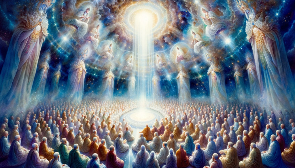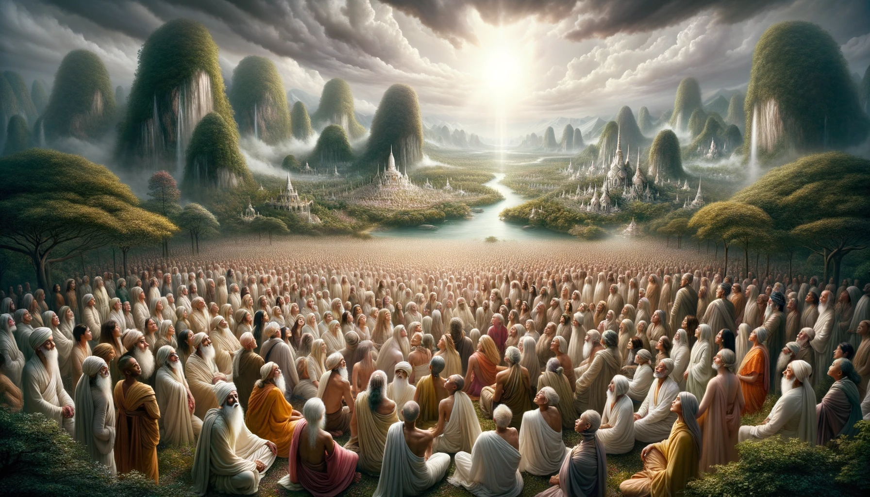 A diverse crowd with eyes filled with wonder and anticipation, looking upwards. The assembly includes monks, nuns, celestial beings, and humans, all united in their eagerness to receive wisdom.