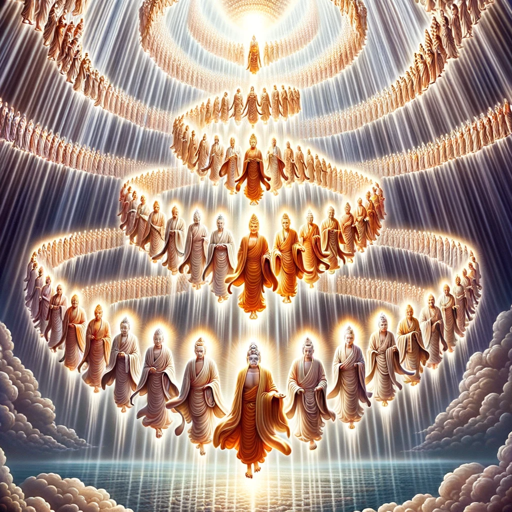 Multiple luminous figures, each bearing a resemblance to Kandrasuryapradipa, representing the twenty thousand Tathāgatas of the same name. They stand in a celestial realm, each illuminating a part of the Dharma.