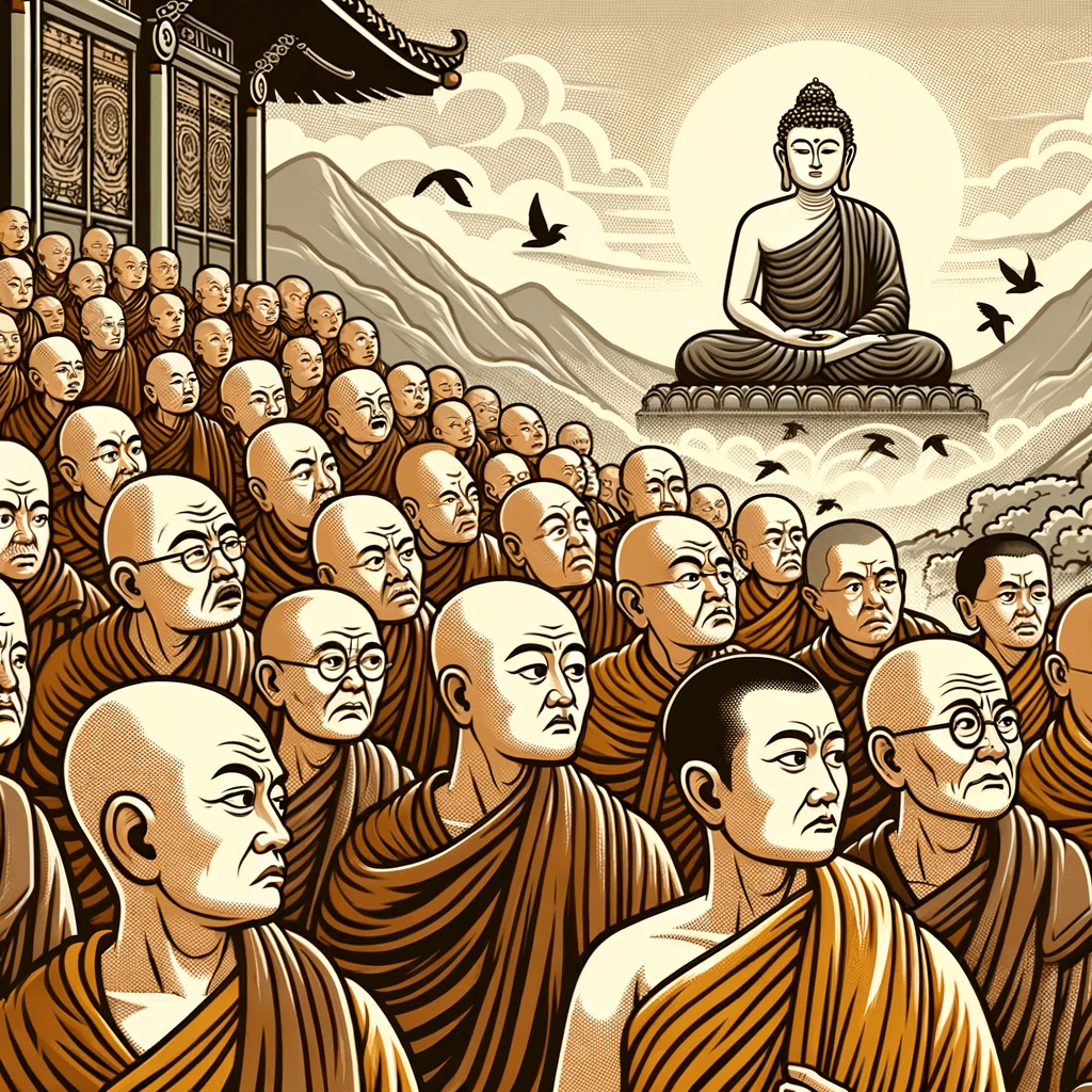 On Eagle Peak, a group of monks, nuns, and lay devotees are depicted leaving the assembly, their faces showing disdain and disappointment. In the background, the Buddha is serene, his gaze understanding and compassionate, watching their departure without any sign of judgment.