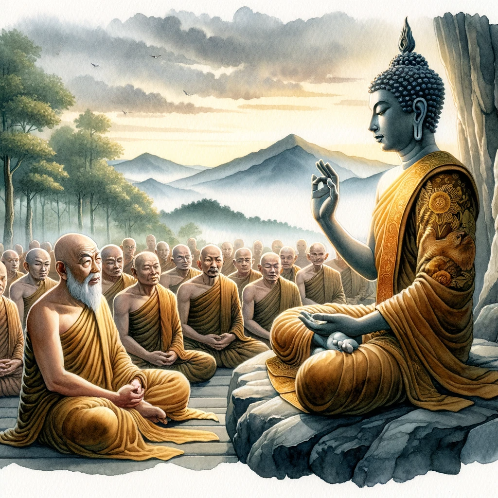 A tranquil scene set at Eagle Peak. The Buddha, seated in a meditative posture, is addressing Sāriputta, who is depicted with utmost reverence. The Buddha’s hand is raised in a gesture of emphasis, drawing attention to the importance of his words. Around them, the remaining assembly members are depicted with expressions of deepened focus, understanding, and gratitude. Their demeanor suggests they have witnessed the earlier departure of the prideful members and have chosen to remain, soaking in every word of the Buddha’s teachings.
