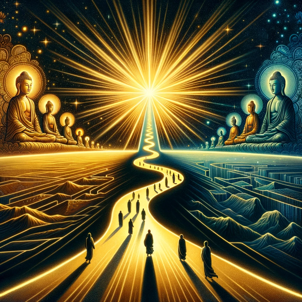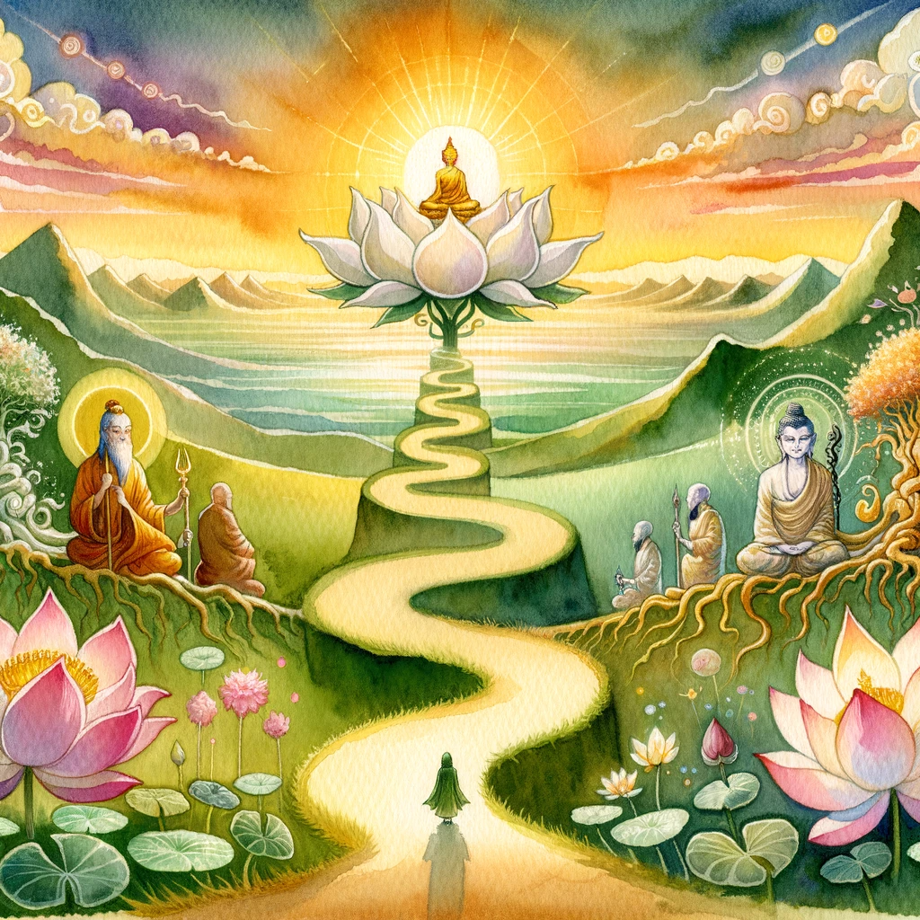 A landscape showing three distinct paths that are intertwined, leading towards a radiant lotus flower on the horizon. Each path is adorned with beings of diverse temperaments and dispositions, showcasing the Buddha’s versatility in guiding various souls towards enlightenment.