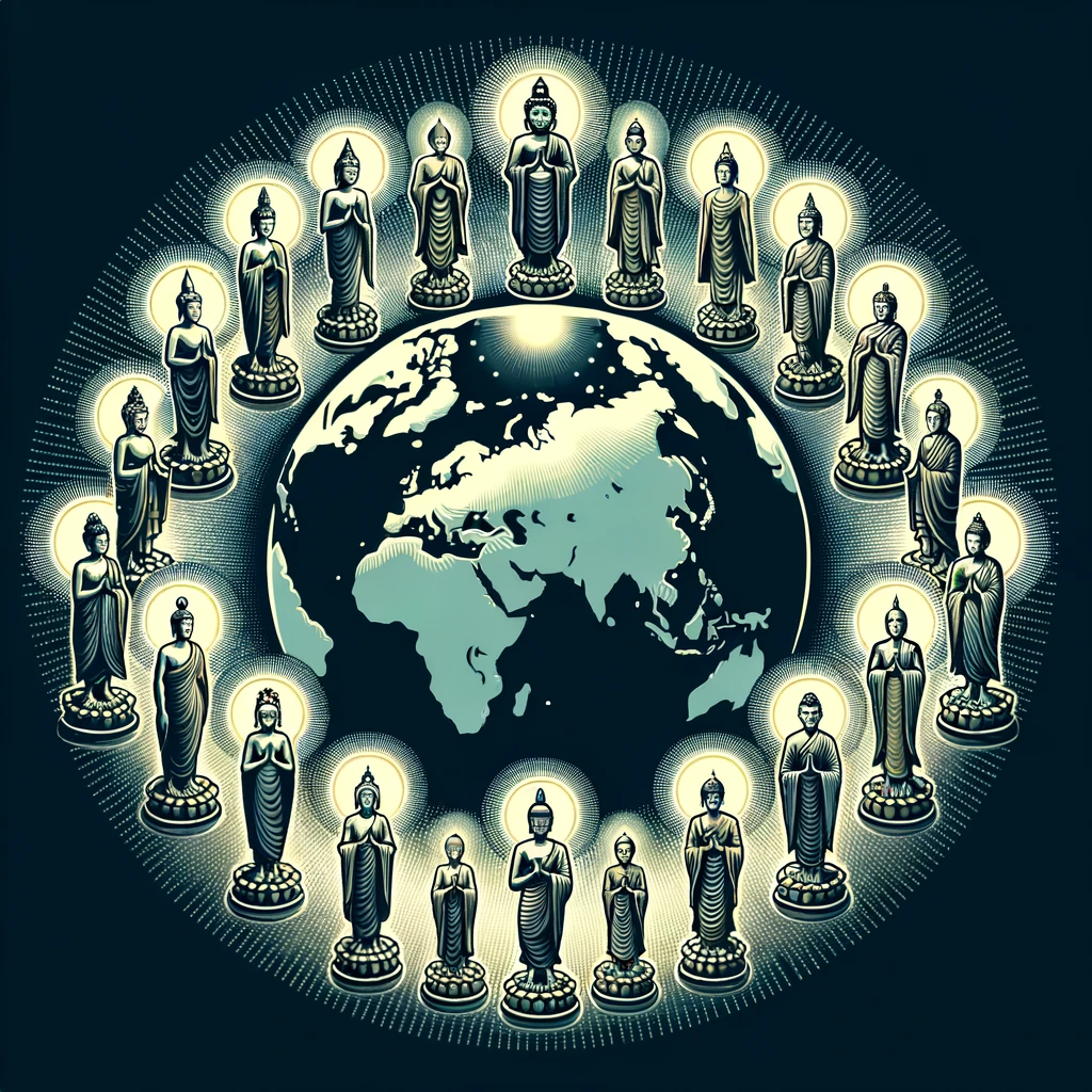 Buddhas of the past, present, and future, each with distinct postures and emanating a unique glow, stand in a circular formation around the Earth. Their collective radiant light beams down, touching various continents and landmarks, symbolizing the timeless and universal dissemination of the teachings.