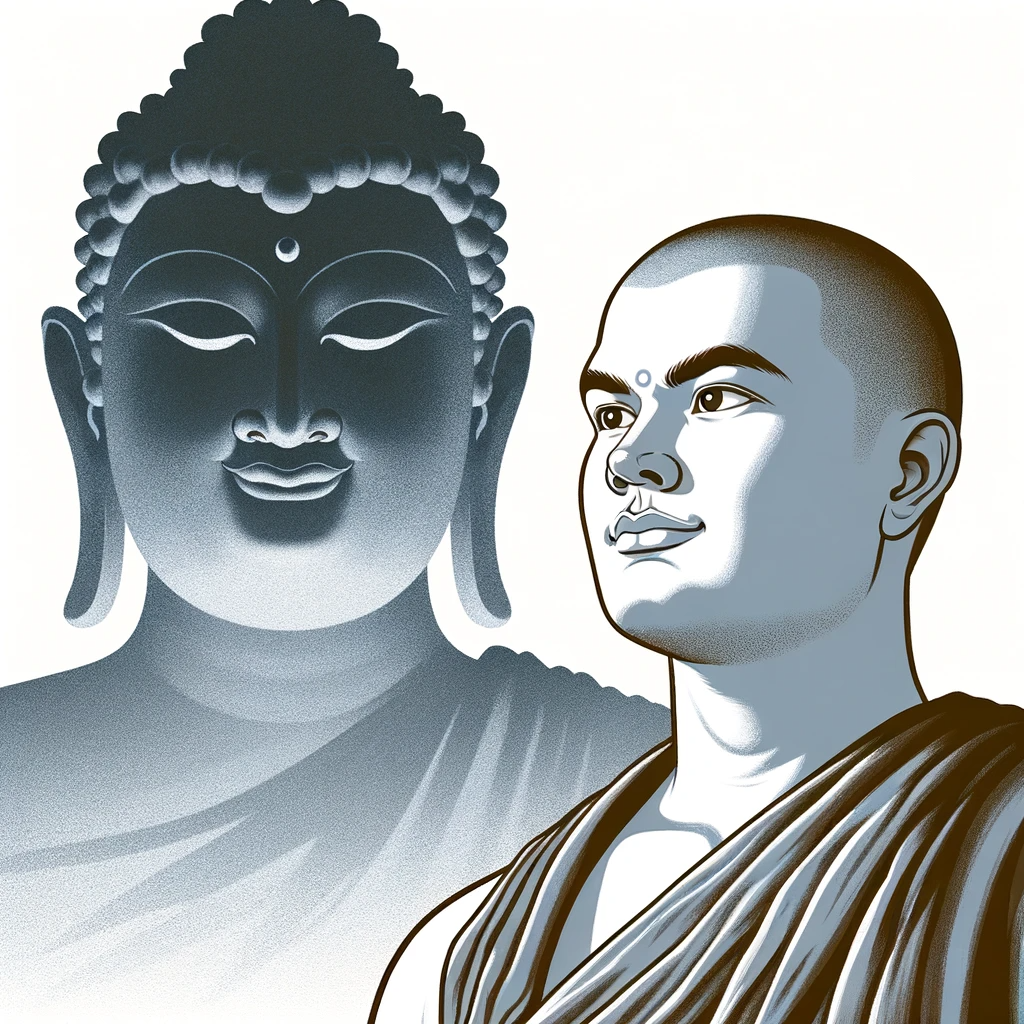 A monk with a proud and conceited expression stands prominently in the foreground. Behind him, an enormous, ethereal silhouette of the Buddha looms, casting a gentle shadow over the monk. This contrast signifies the immense depth and vastness of the Buddha’s teachings compared to the monk’s narrow and limited understanding.