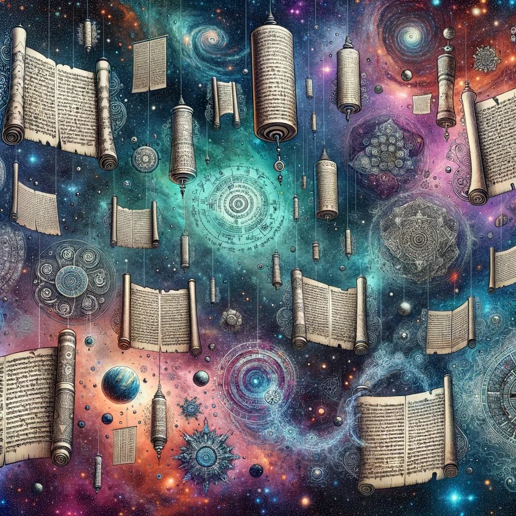 An expanse of space filled with galaxies, nebulae, and stars serves as the backdrop. Floating amidst this cosmic scene are ancient scrolls and sacred texts. Some of the texts are vibrant and clear, while others appear faded with age, all symbolizing the timeless teachings of the Dharma. The overall feeling evoked is one of reverence for the eternal nature of these teachings.