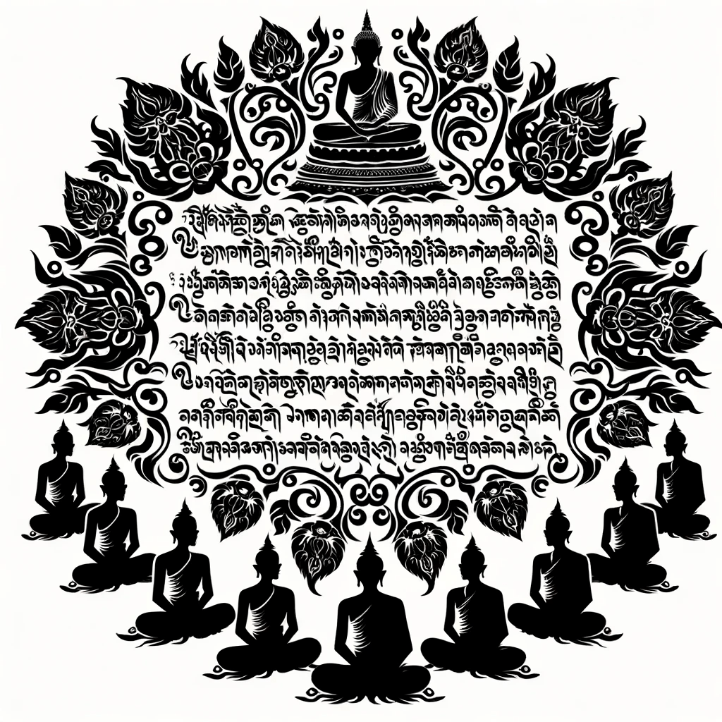 Elegant script showcasing stanzas of the Buddha’s verses, surrounded by intricate motifs. Silhouettes of the assembly members are scattered around the verses, each in deep contemplation, their postures embodying reverence and thoughtfulness.