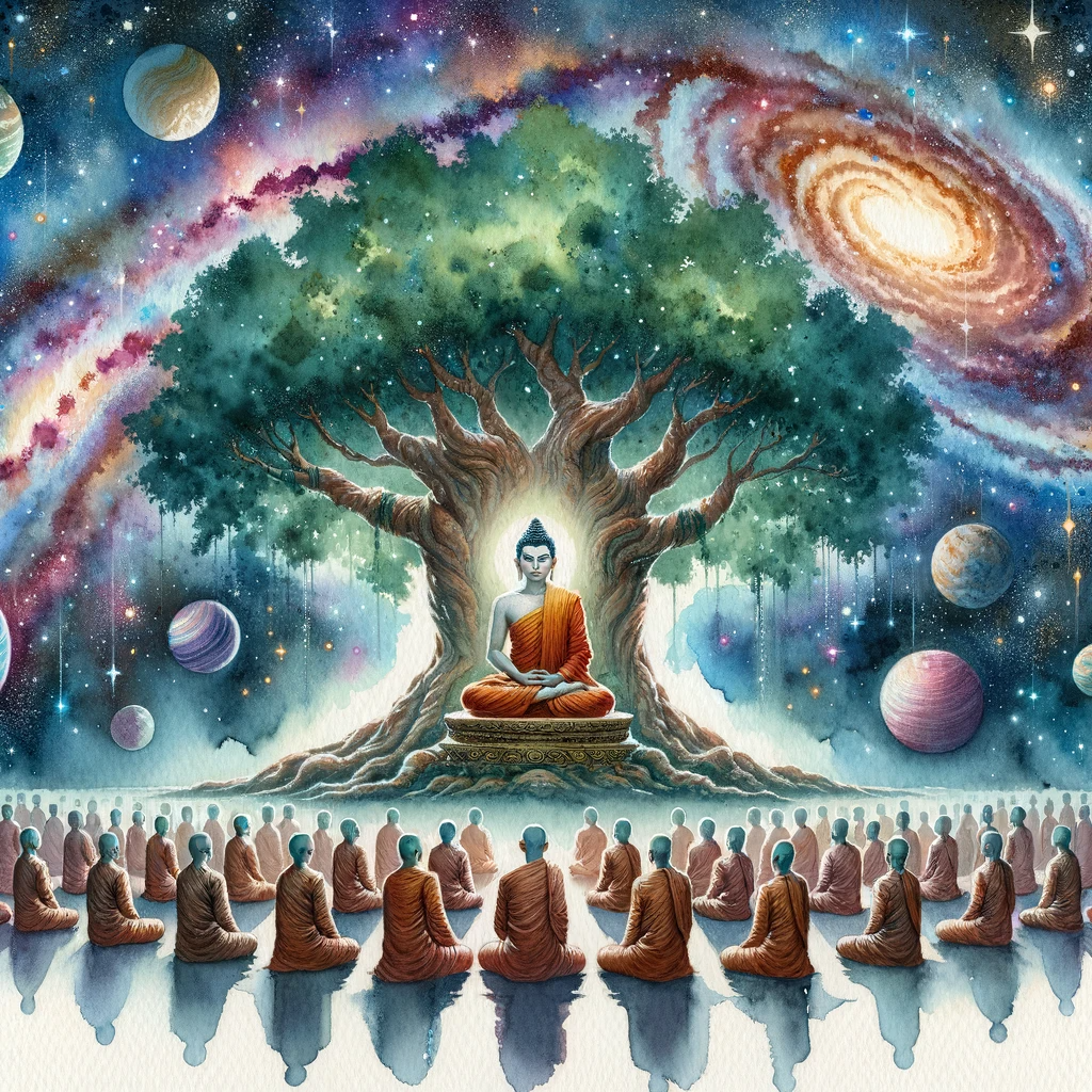 The Buddha meditating under the expansive Bodhi tree with the attentive assembly members around him. The universe with its majestic galaxies, twinkling stars, and celestial wonders, unravels above, symbolizing the eternal and universal resonance of the Dharma. The Bodhi tree’s roots are firmly grounded, indicating the ageless and undying path of the teachings.