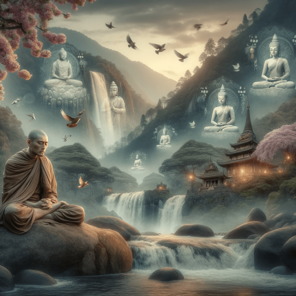 Tranquil mountainous landscape with waterfalls, birds, and blossoming trees at dawn. Sariputta sits cross-legged on a rock, deep in thought with a sorrowful expression. Ethereal images of Bodhisattvas with symbolic objects float around him.