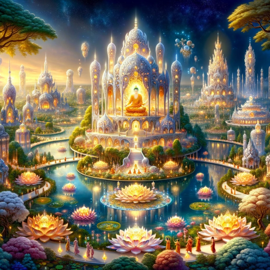 Ethereal realm representing Buddha-land of Padmaprabha. Vibrant landscape with a lapis lazuli palace, surrounded by jewel trees with precious blossoms and fruits. Diverse Bodhisattvas walk on jewel lotuses holding scriptures. Center, Padmaprabha sits on a lotus throne with a glowing aura. Above, translucent verses detail Sariputta’s future. Distance, silhouette of ‘The Lotus-Bearing One with Majestic Steps’.