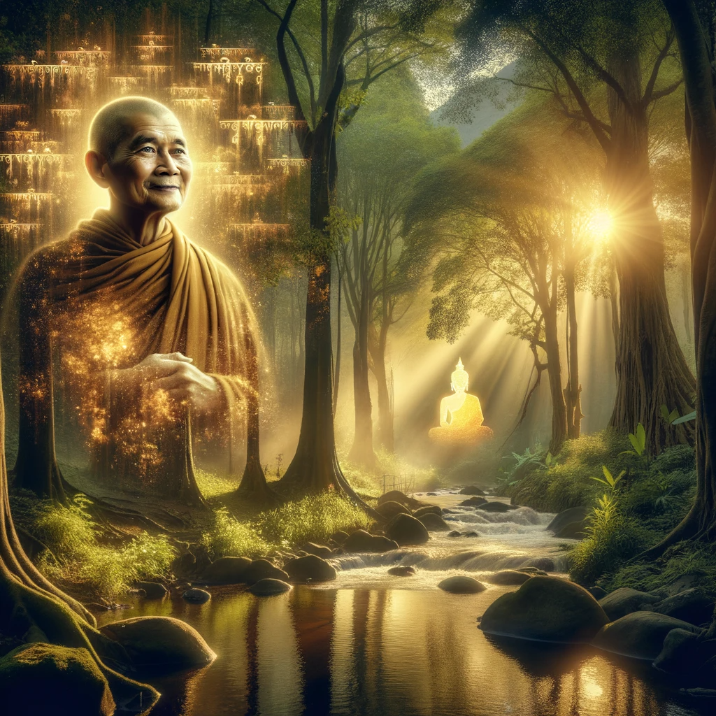 A serene forest with ancient trees and sunlight filtering through leaves. A stream flows, reflecting the sky. Sariputta, an Asian monk in traditional robes, stands with a radiant face, hands clasped. Ghostly memories of him in contemplation appear around. Above, shimmering golden words form his verse. In the background, a glowing silhouette of the Buddha emanates a warm light.