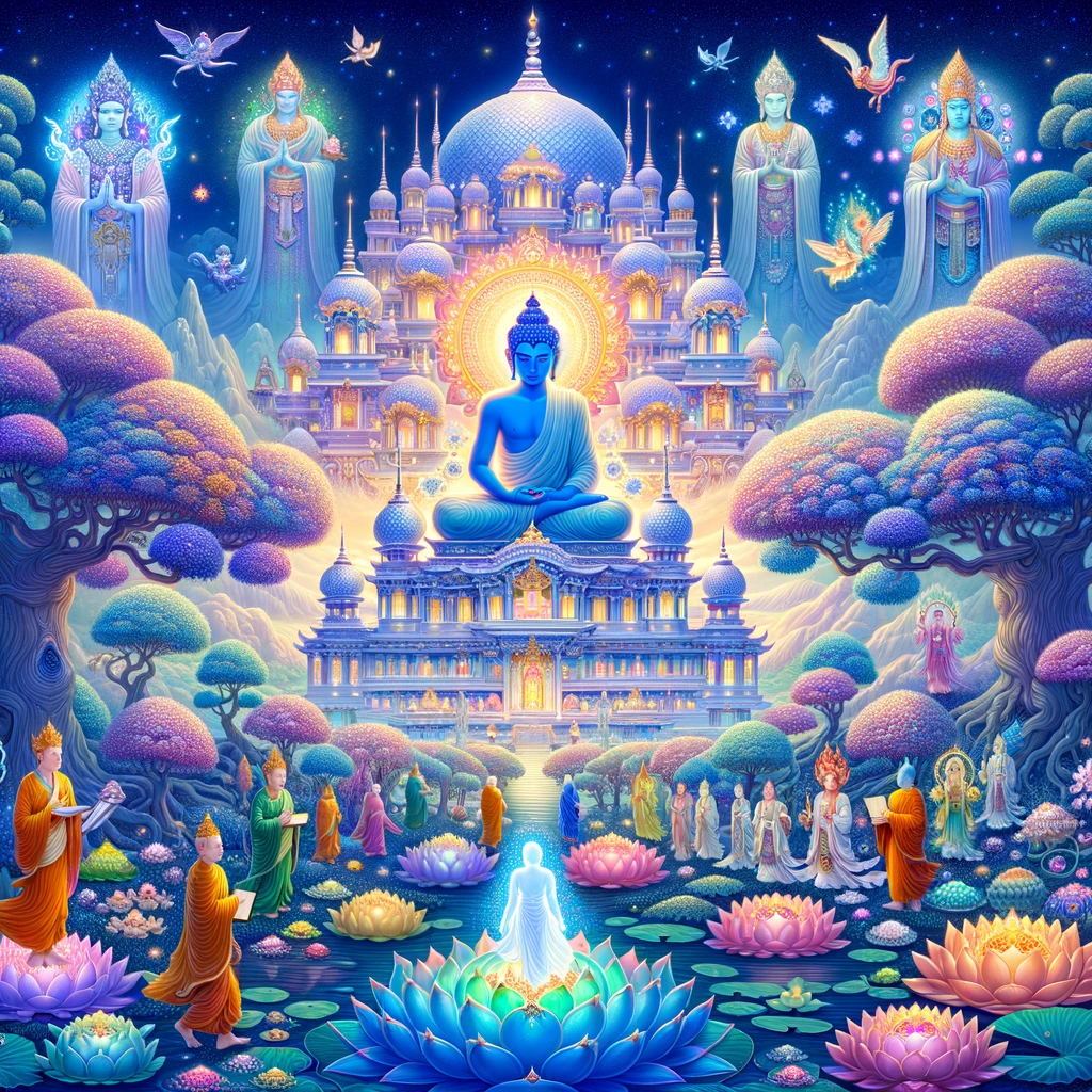 Ethereal realm representing Buddha-land of Padmaprabha. Vibrant landscape with a lapis lazuli palace, surrounded by jewel trees with precious blossoms and fruits. Diverse Bodhisattvas walk on jewel lotuses holding scriptures. Center, Padmaprabha sits on a lotus throne with a glowing aura. Above, translucent verses detail Sariputta’s future. Distance, silhouette of ‘The Lotus-Bearing One with Majestic Steps’.