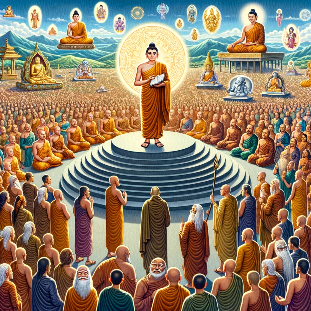 Vast gathering ground with diverse beings—humans, gods, Maras, Brahmas, ascetics, Brahmans. Center, Lord Buddha on a raised platform, teaching. Sariputta stands confidently at the forefront.
