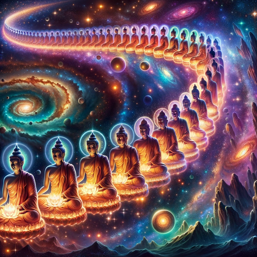 An otherworldly cosmic sky filled with brilliant stars, mesmerizing galaxies, and radiant lights. A succession of Buddhas, each illuminated in a distinct color, graces the celestial canvas, representing the Buddha lineage’s timeless journey. Their arrangement in a flowing sequence signifies the teachings’ evolution and passage through time. At the end of this sequence, a distinguished Buddha tenderly holds a glowing lotus, alluding to ‘The Lotus-Bearing One with Majestic Steps’ and the prophecy of the teachings’ everlasting legacy.
