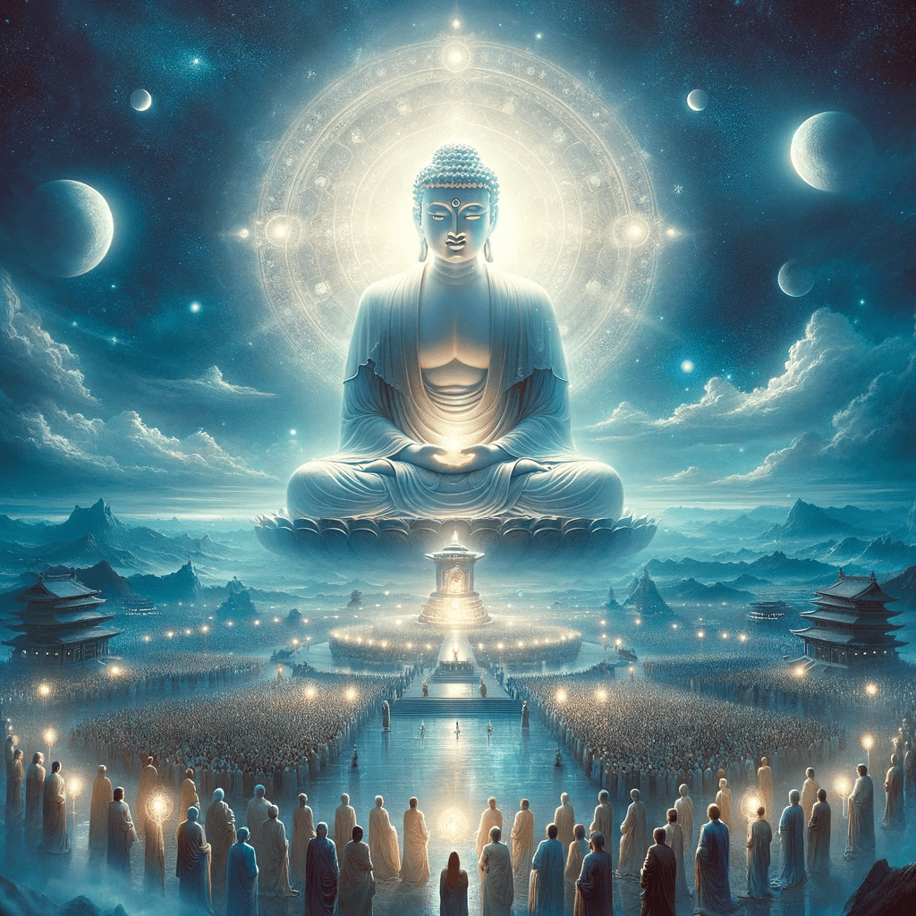 The lifespan of this enlightened one, the ‘Moon Signal,’ will span twelve intermediate epochs. His actual teachings will last for twenty such epochs, and the facsimile, reproduction, or imitation of his teachings will endure for the same length. This enlightened one, appearing as a great celestial body in the sky, will impart his teachings to the monks. He will guide and educate thousands of Bodhisattvas and disciples on their path to enlightenment.