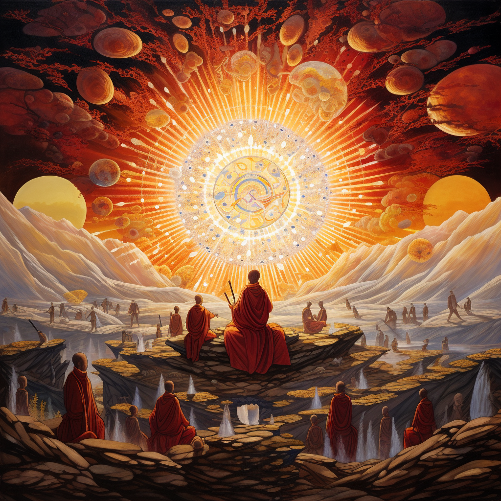 O monks, the sixteen young princes, still in their childhood, approached the Lord Mahabhignagnanabhibhu, the Tathagata, with a sense of reverence and awe. After celebrating him with heartfelt verses, they pleaded with the Lord to set in motion the wheel of the law. Their voices rang out with earnestness and devotion: “Preach the law, O Lord; preach the law, O Sugata. Bring well-being and joy to the people, and show compassion to the world. Let your teachings spread for the benefit, happiness, and welfare of all beings, both gods and men.” Their plea was filled with a deep longing for the spiritual guidance of the enlightened one, and they expressed their sentiments further with the following verses:
