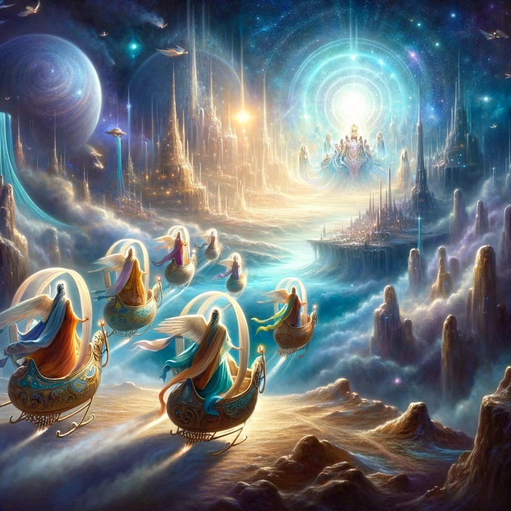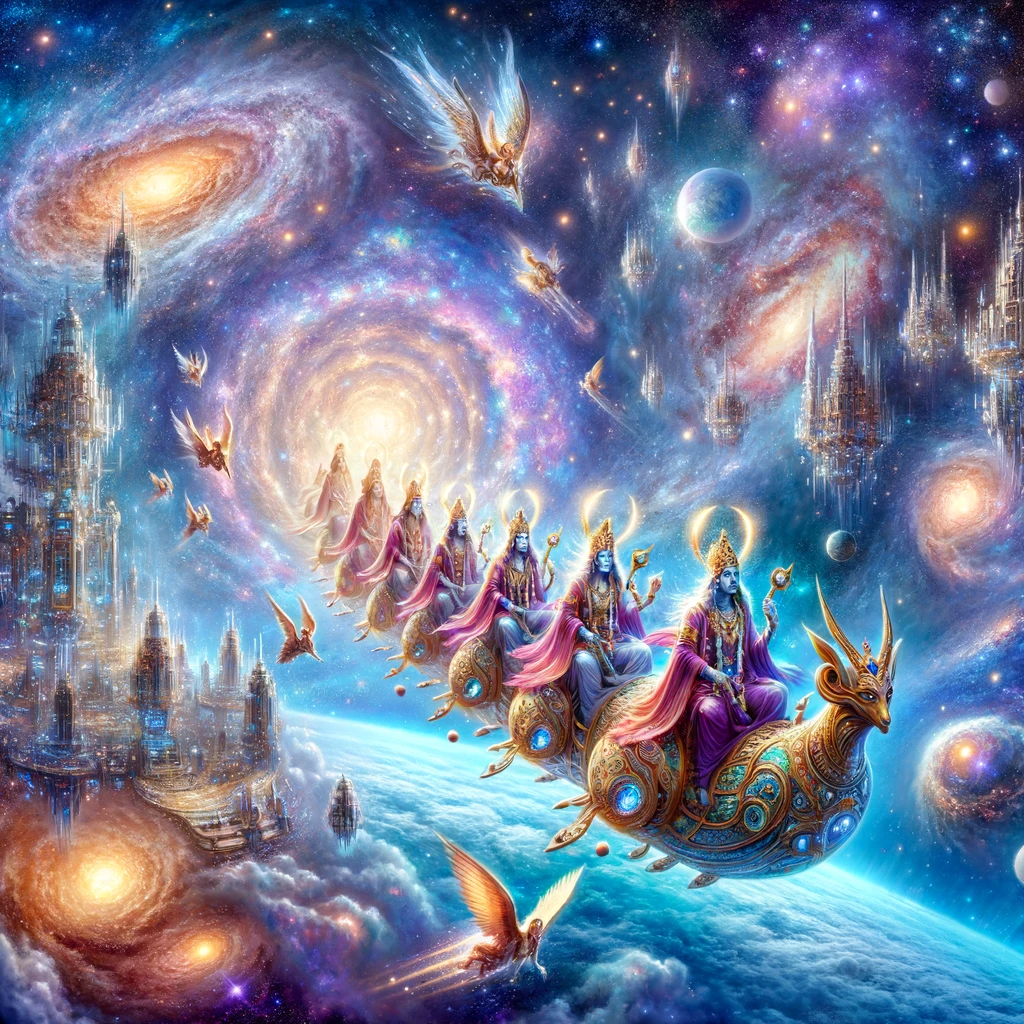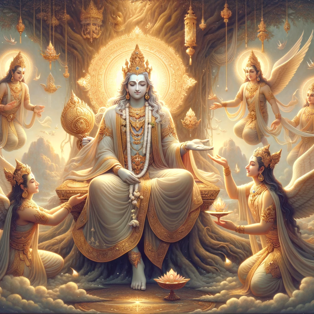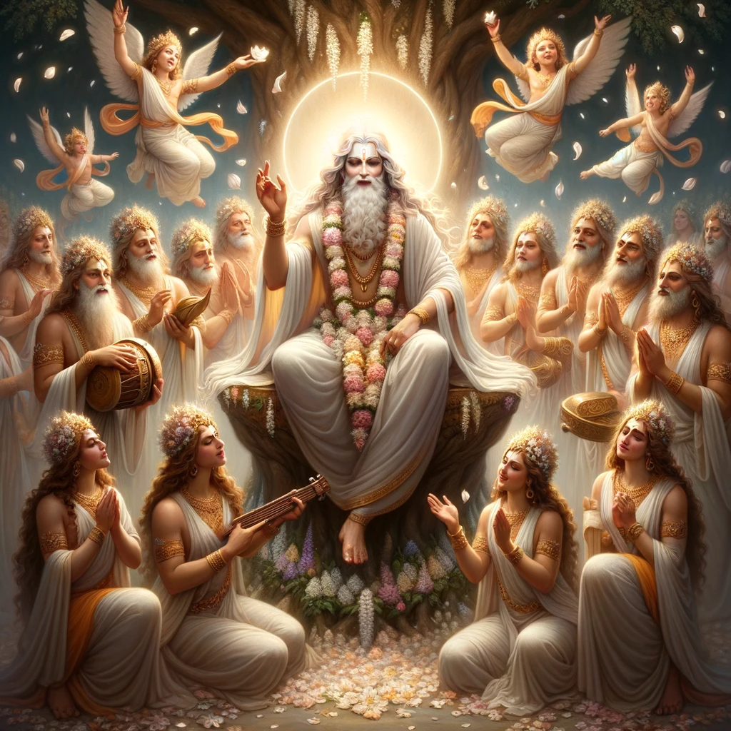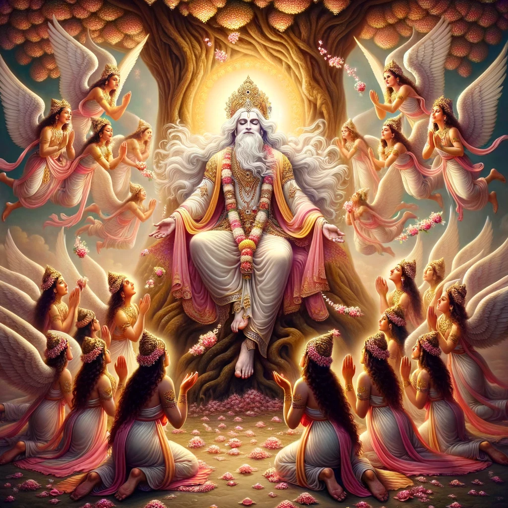 With awe and reverence, the Brahma angels approached the Lord, bowing at his feet. They circled him many hundred thousand times, moving from left to right, showering him and the tree of enlightenment with flowers from their enormous bags. The flowers rained down over a distance of ten yojanas, a tribute as grand as Mount Sumeru itself.
