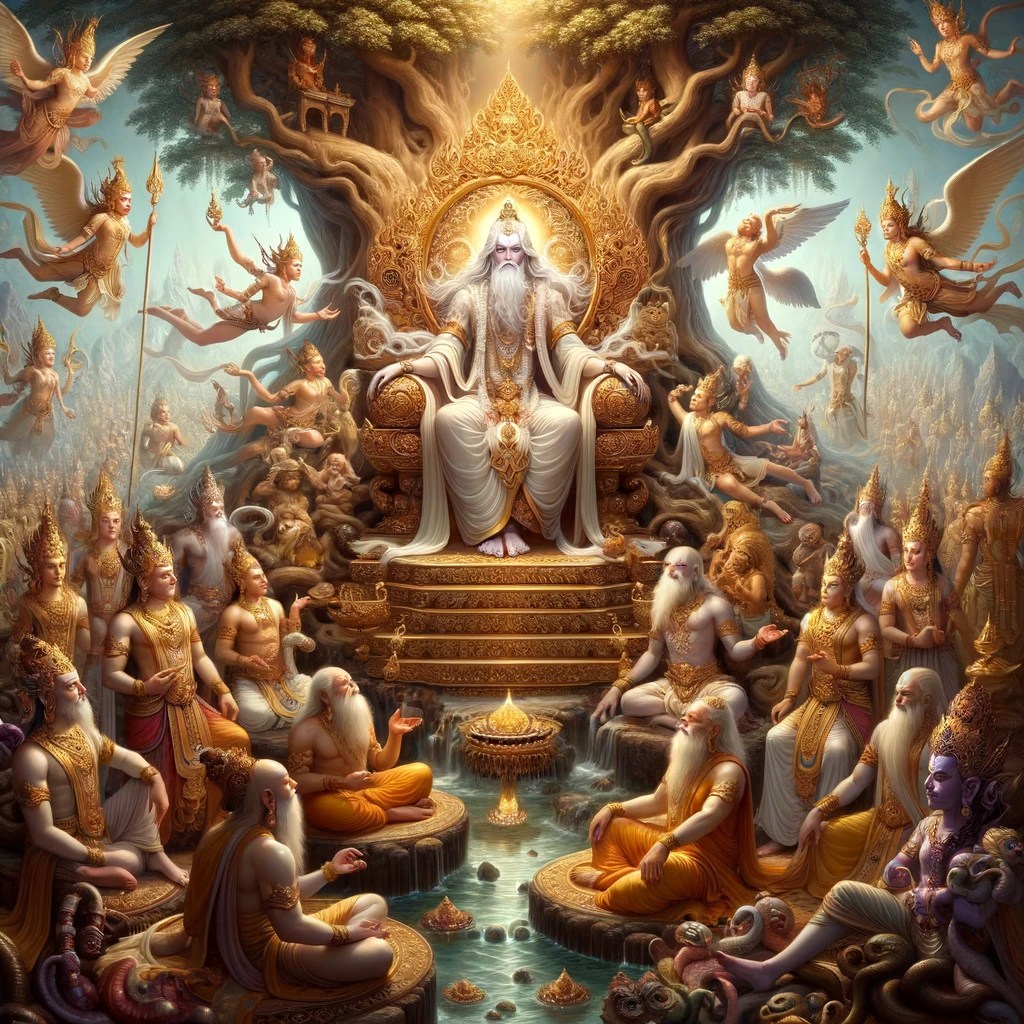 There, on the summit of the exalted terrace of enlightenment, sat the Lord Mahabhignagnanabhibhu (Great-Knowledge-and-Dominance) , the Tathagata, on a royal throne at the foot of the tree of enlightenment. He was surrounded by a diverse assembly of beings: gods, Nagas, goblins, Gandharvas, demons, Garudas, Kinnaras, great serpents, men, and non-human entities. His sons, the sixteen young princes, stood nearby, urging him to set in motion the wheel of the law.