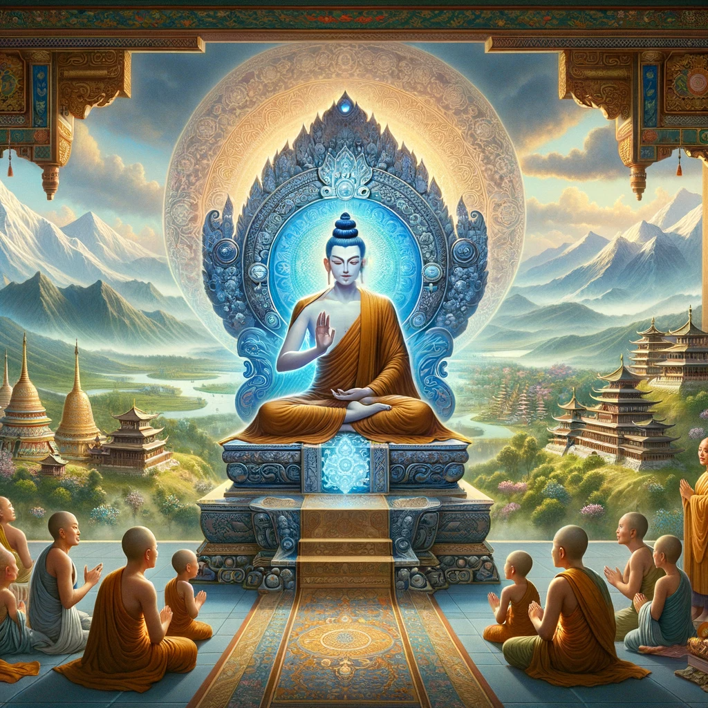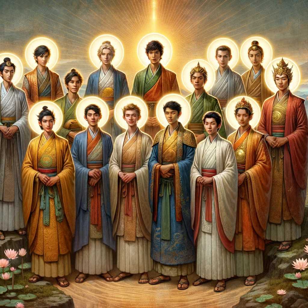 I proclaim to you, monks, with utmost certainty, that the sixteen youthful princes who served as novices and interpreters of the law under the Lord’s guidance have all reached the pinnacle of supreme, perfect enlightenment. They now reside in various Buddha-lands across the vastness of space, each one preaching the law to countless disciples and Bodhisattvas.