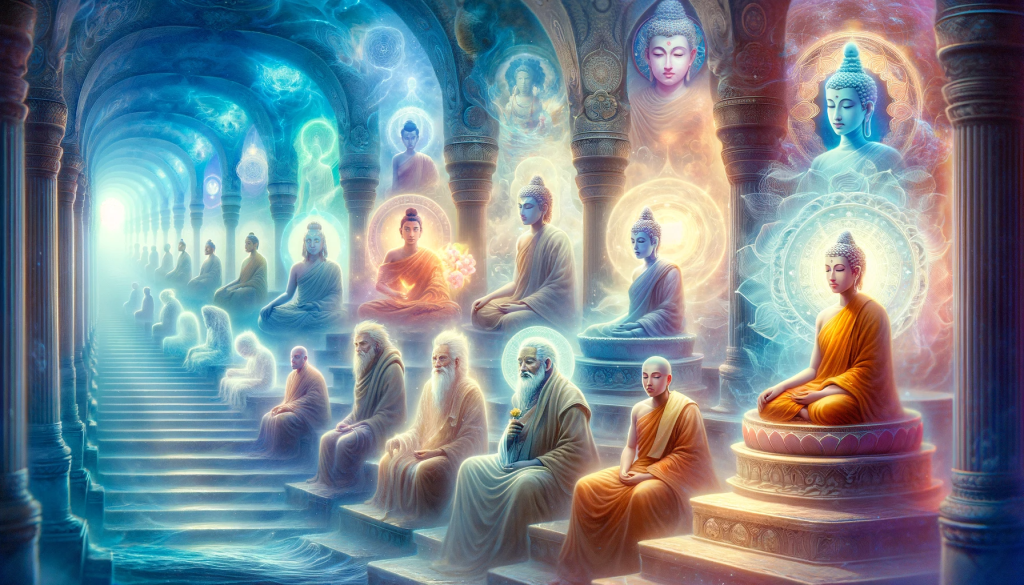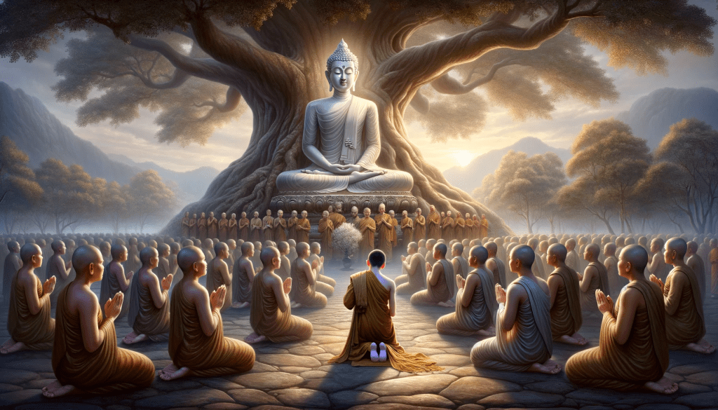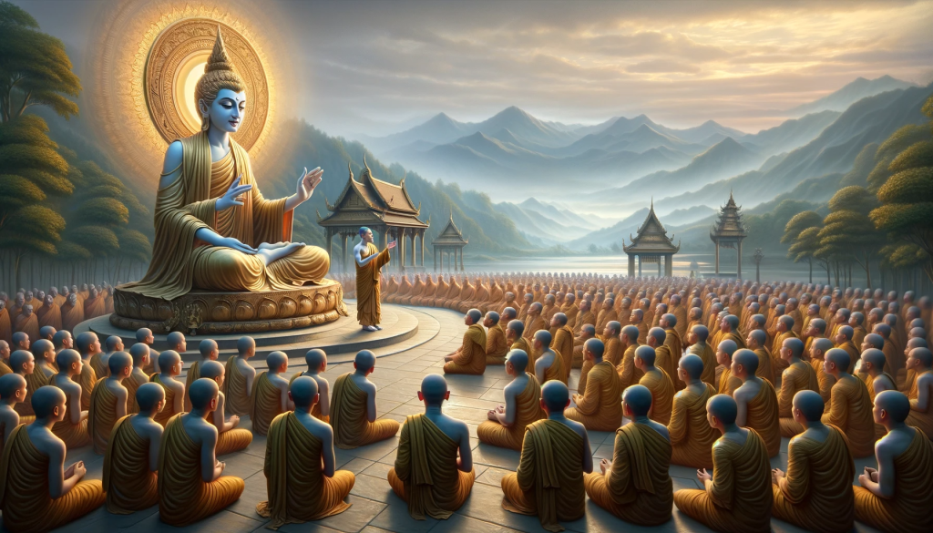 He marveled at how the Tathagatas (enlightened beings) skillfully conformed to this multifaceted world and preached the law with grace and wisdom. Purna knew that only the Tathagata understood his ancient path and inclinations. After paying his respects, he stood aside, his eyes fixed on the Lord, showing his deep reverence.