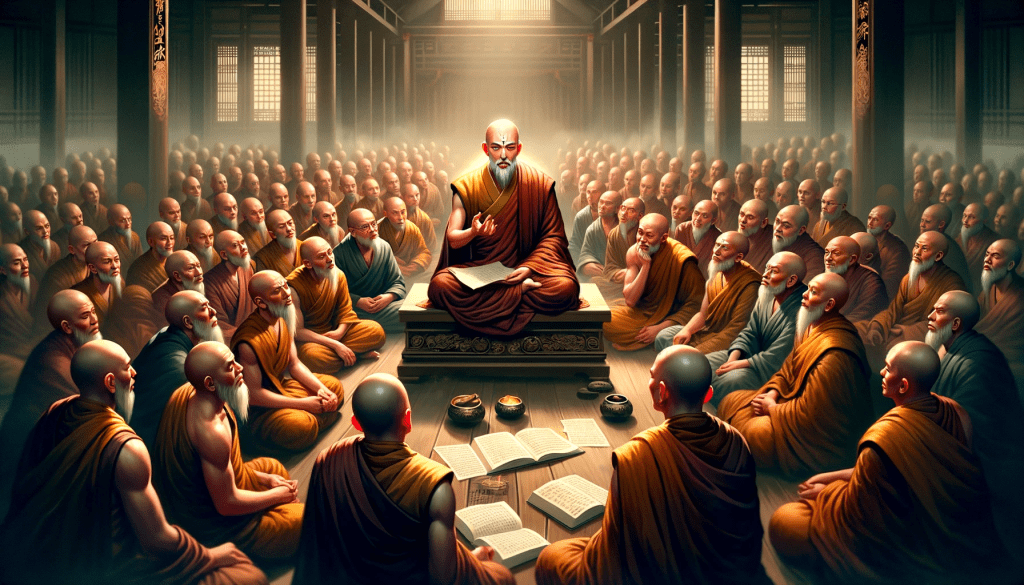 The Lord, recognizing Purna’s mental disposition, addressed the assembly of monks. He praised Purna for his many virtues and his diligent study of the true law. Purna’s unwearied preaching had excited and inspired countless beings, and he was second only to the Tathagata in his abilities. He was not just a keeper of the Lord’s true law but a master who had served under ninety-nine Buddhas in the past, guiding innumerable beings toward enlightenment.