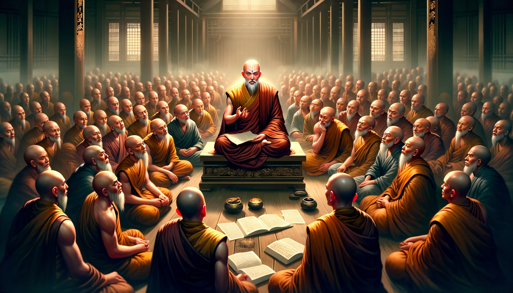 The Lord, recognizing Purna’s mental disposition, addressed the assembly of monks. He praised Purna for his many virtues and his diligent study of the true law. Purna’s unwearied preaching had excited and inspired countless beings, and he was second only to the Tathagata in his abilities. He was not just a keeper of the Lord’s true law but a master who had served under ninety-nine Buddhas in the past, guiding innumerable beings toward enlightenment.