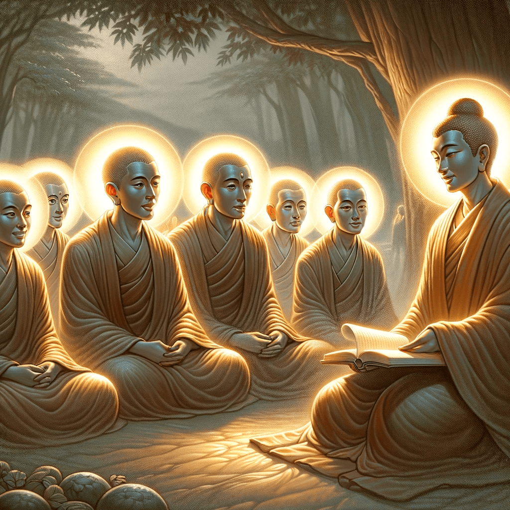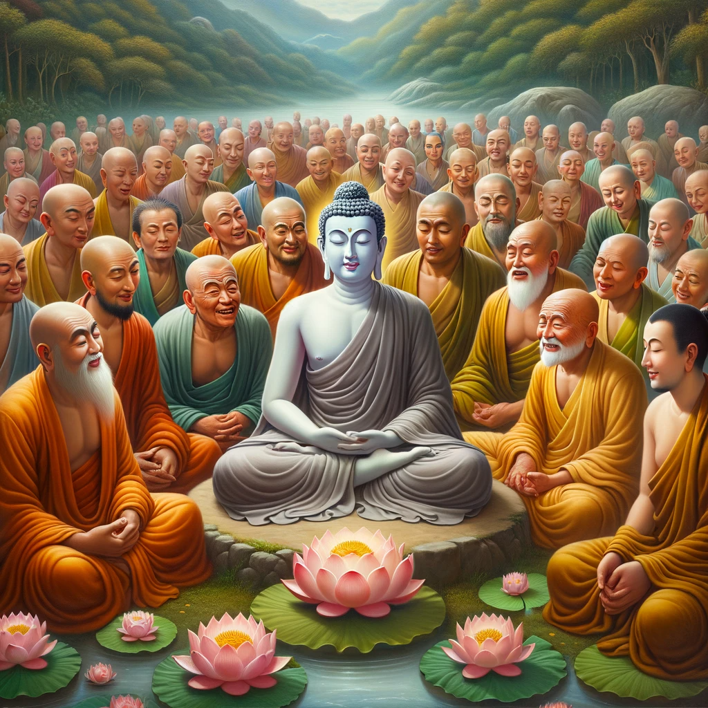 One day, the old friend who had given him the gem finds him again and is shocked at his struggles. He tells him, ‘My good friend, why are you struggling so? I have hidden a priceless gem in your garment to ensure your comfort and fulfillment. Use this gem to buy all you need. It’s foolish to struggle when you have such wealth.’In the same way, O Lord, you have instilled in us a pearl of profound wisdom, even though we were unaware of it. We thought we had reached Nirvana as Arhats, but we were merely content with a shallow understanding. Thankfully, our longing for greater wisdom never ceased, and you’ve shown us the truth. You’ve taught us that we shouldn’t be content with such limited knowledge, that there is more to explore and learn. Now you predict our journey to supreme and perfect understanding.”And at that moment, the five hundred self-controlled Arhats, led by Anna Kondanna, expressed their realization in the following verses: