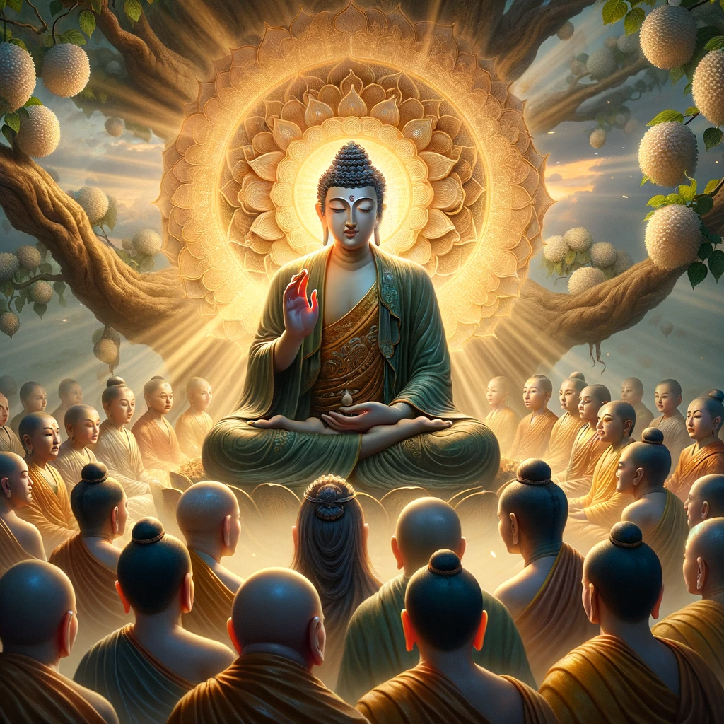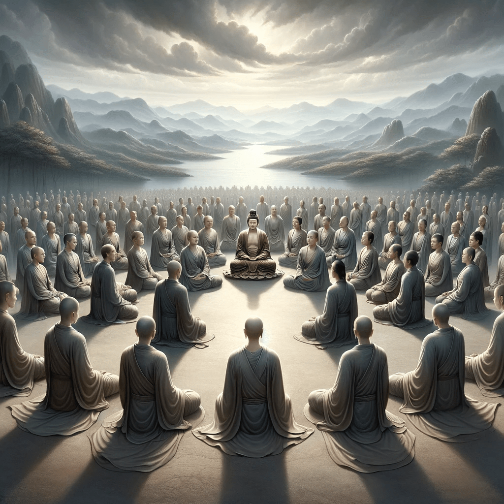 In the gathering were eight thousand Bodhisattvas, new to the path, and a thought arose within them: “We’ve never before witnessed such an extraordinary prophecy for Bodhisattvas, let alone disciples. What could be the reason? What drives this moment?” Sensing their thoughts, the Lord addressed them: “Young seekers of truth, both Ānanda and I conceived the idea of supreme enlightenment at the same moment, in the presence of the Tathagata known as ‘The One Who Has Risen with a Profound Passion for the Dharma,’ the enlightened one. During that time, Ānanda was devoted to great learning, while I pursued relentless effort. Thus, I reached supreme enlightenment more quickly, while Ānanda, known as the Keeper of the Buddhas’ Sacred Teachings, took a vow to guide Bodhisattvas to full realization.”