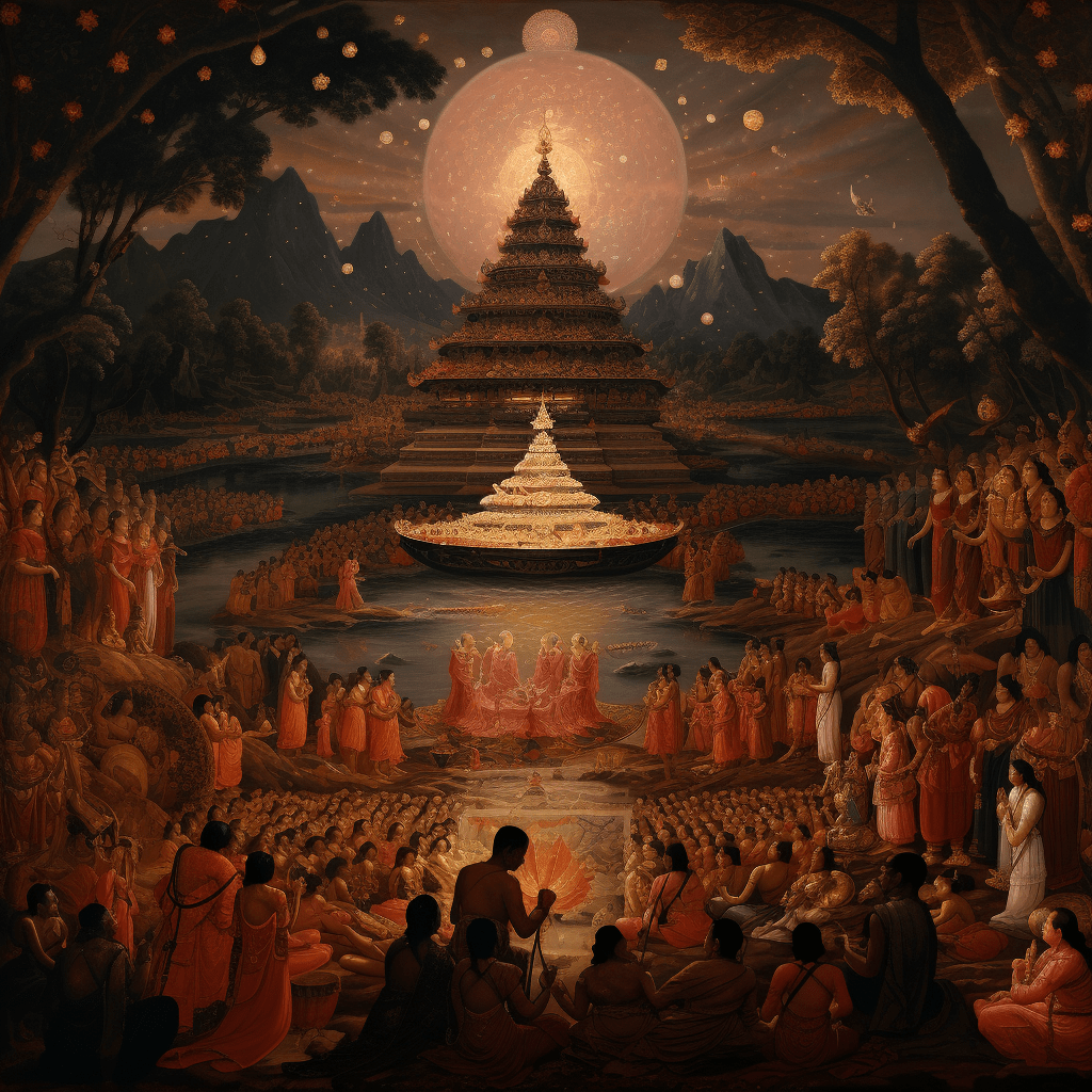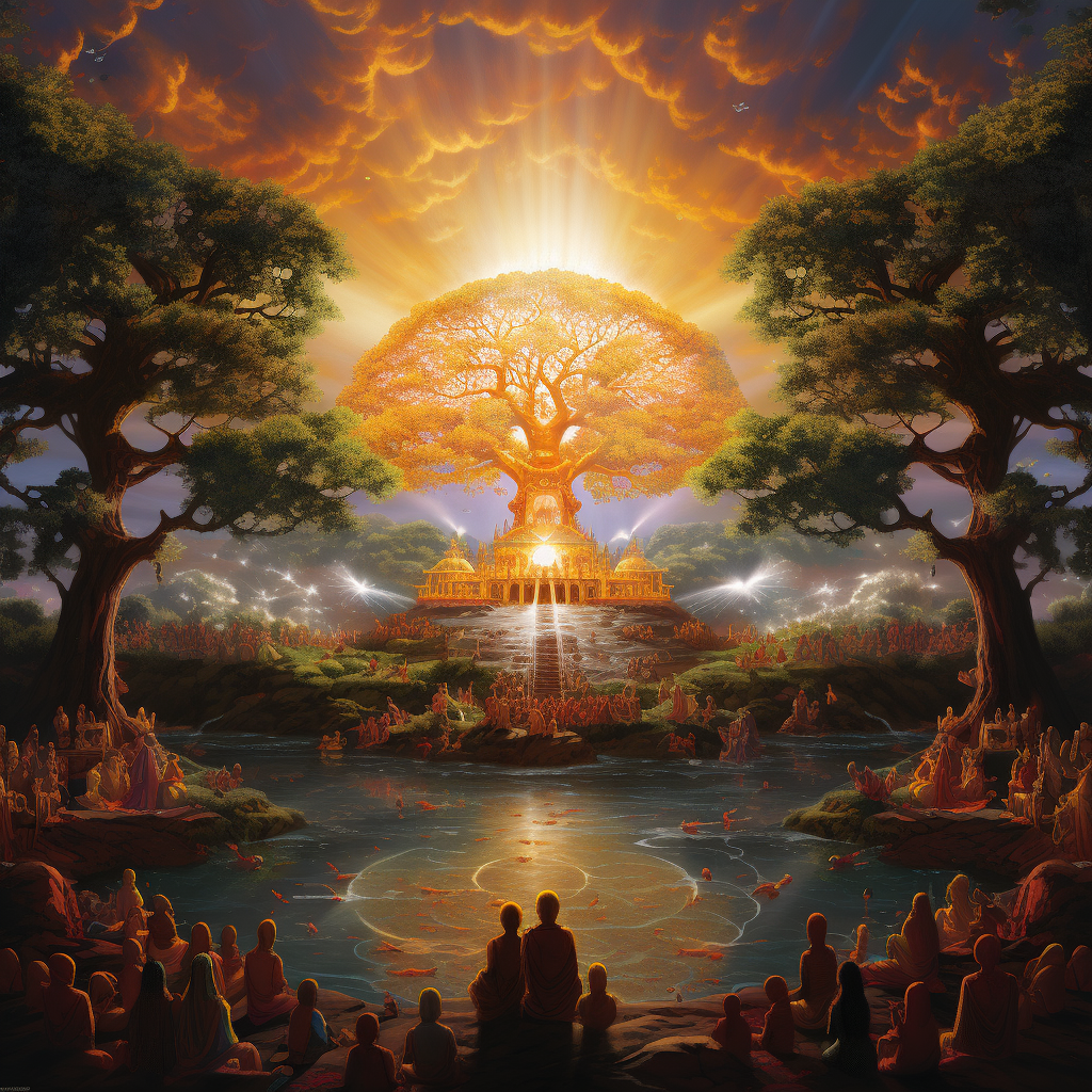 At that moment, the entire realm was filled with Tathāgatas, each representing a unique embodiment of enlightenment. Yet the special manifestations of Lord Sākyamuni had not arrived from any horizon. Preparing for their arrival, Sākyamuni began to expand the space, creating room for more Buddhas who were coming one after the other.