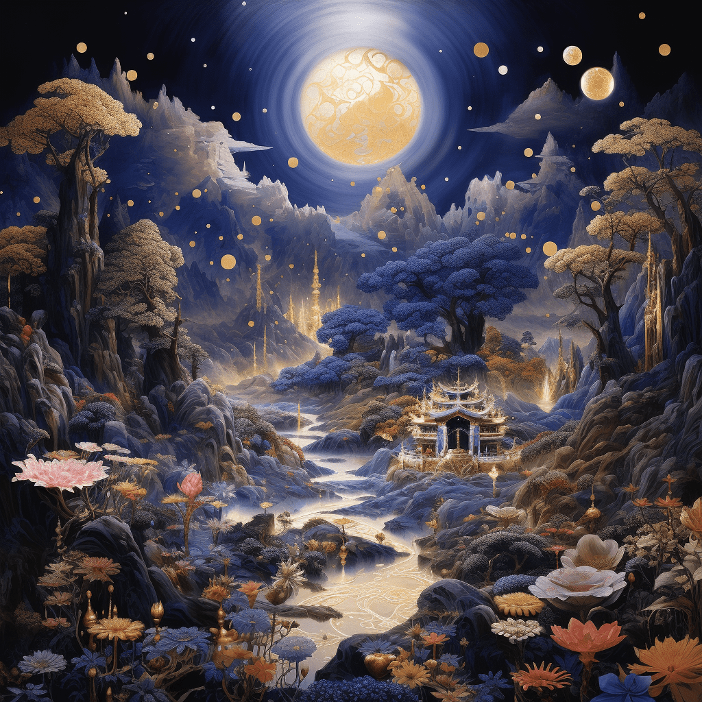 In every direction, an astonishing number of Buddha-lands emerged, each made of lapis lazuli and adorned with a web of seven precious substances and gold. These fields were decorated with celestial bells and scattered with heavenly Mandārava flowers, covered with divine canopies, and filled with the sweet fragrance of heavenly incense. These divine landscapes were void of ordinary earthly structures, mountains, oceans, and beings of various realms. Everything was transformed into one Buddha-lands, a harmonious and beautiful soil, filled with towering trees made of precious gems.