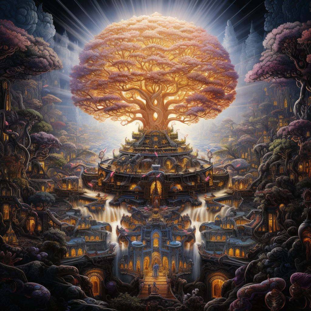 These jewel trees, five hundred yojanas tall and wide, were surrounded by equally grand thrones, each one sparkling and magnificent. The arriving Buddhas took their places, sitting cross-legged at the base of each tree. Sākyamuni continued this act, creating more worlds in every direction, each one without ordinary earthly features and filled with the splendor of lapis lazuli and resplendent jewel trees.