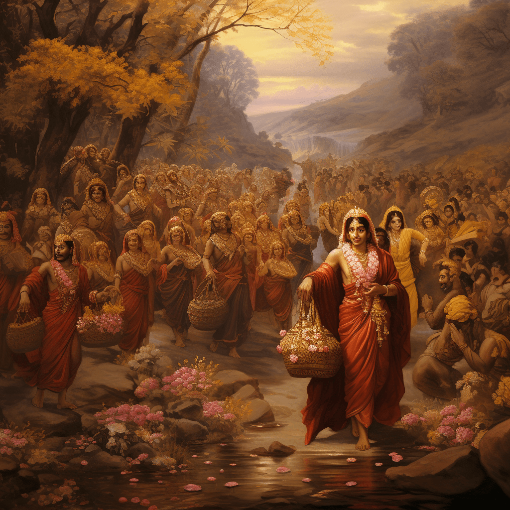 These Tathāgatas took their thrones, and then they sent their closest followers on an extraordinary mission. They provided them with bags filled with radiant jewel flowers and said to them: “Go, noble seekers, to the mountain known as Gridhraktila, where Lord Sākyamuni, the enlightened one, resides. Pay homage to him and inquire about his health, well-being, and the welfare of his followers, the Bodhisattvas, and disciples. Shower him with these jewels and request of him: ‘Would the Lord Tathāgata please unveil this great Stūpa of jewels?’”