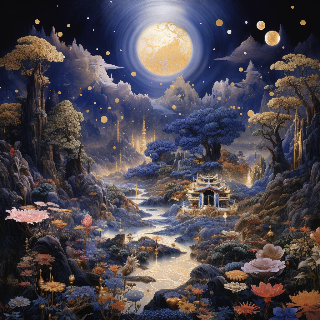 In every direction, an astonishing number of Buddha-lands emerged, each made of lapis lazuli and adorned with a web of seven precious substances and gold. These fields were decorated with celestial bells and scattered with heavenly Mandārava flowers, covered with divine canopies, and filled with the sweet fragrance of heavenly incense. These divine landscapes were void of ordinary earthly structures, mountains, oceans, and beings of various realms. Everything was transformed into one Buddha-lands, a harmonious and beautiful soil, filled with towering trees made of precious gems.