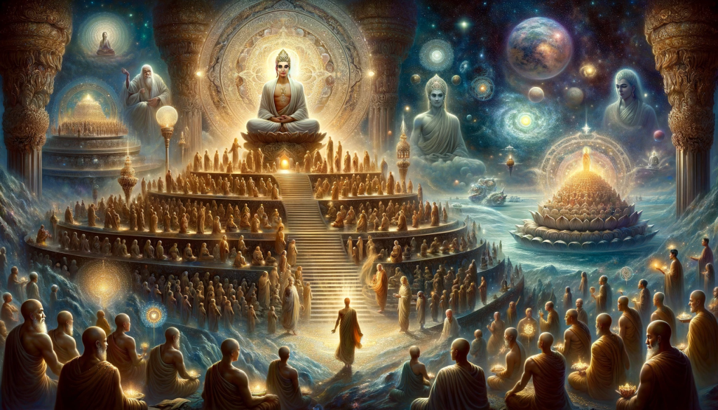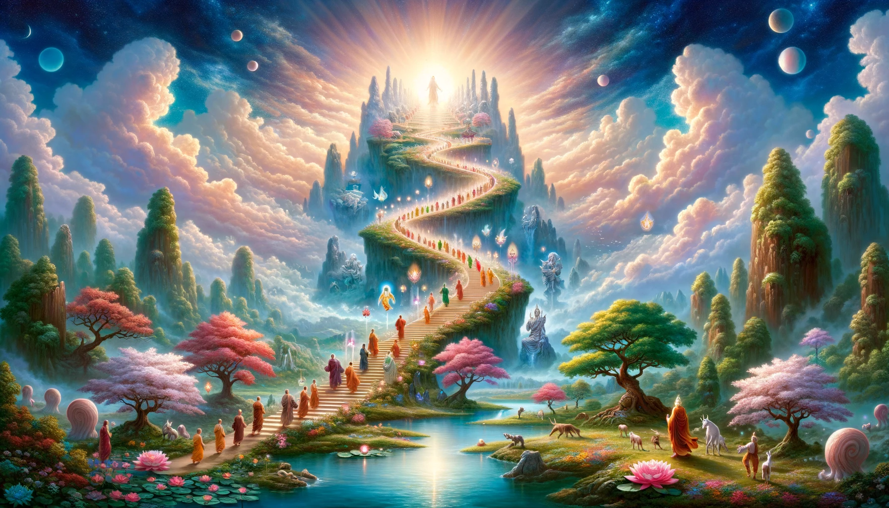I tell you, monks, I declare to you: This Devadatta, the monk, will become a Tathāgata named Devarāja (meaning “King of the Gods”), an enlightened being, in the world called Stairs of the Gods, after countless, immeasurable eons. The lifetime of that Tathāgata Devarāja will be twenty intermediate kalpas. He will preach the law extensively, and beings as numerous as the sands of the Ganges River will abandon evil and attain enlightenment through him. Some will aspire to individual enlightenment, while others, as numerous as the sands of the Ganges, will aspire to supreme, perfect enlightenment and develop unshakable patience.
