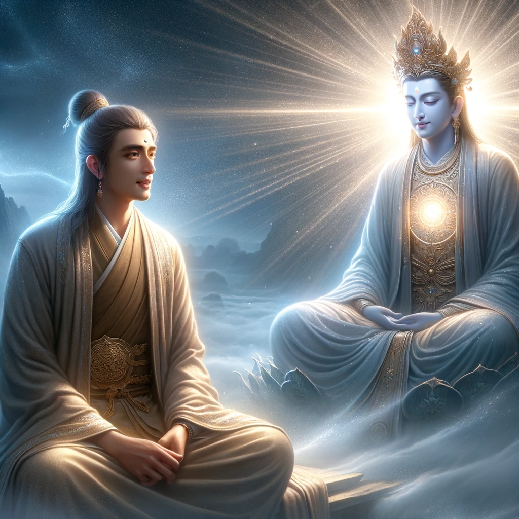 At that moment, a spiritual seeker named Peak of Wisdom, who came from the realm of enlightenment, spoke to the Enlightened One, Prabhūtaratna: “My Lord, shall we return to our realm of enlightenment?” But the Buddha Sākyamuni replied, “Wait a moment, young seeker. First, speak with my disciple, Mañjuśrī, to discuss a matter of spiritual truth.”