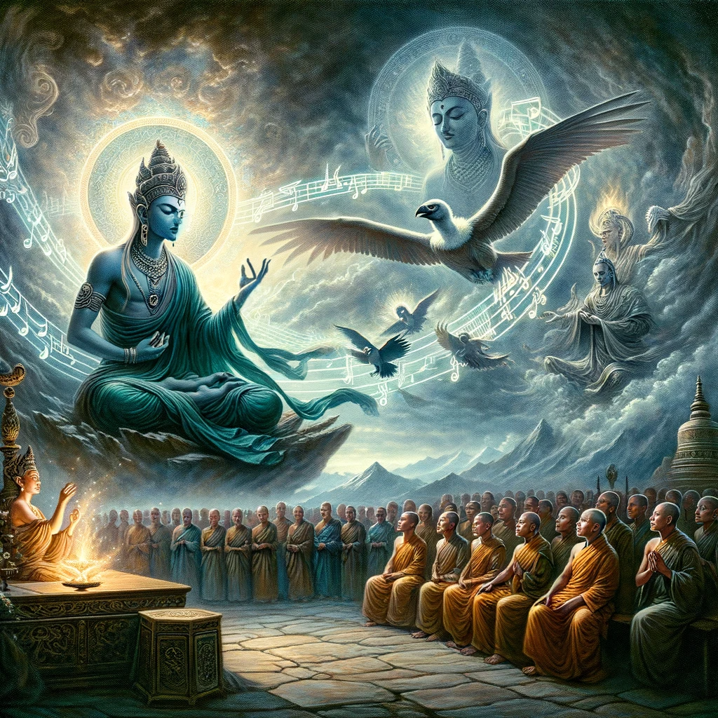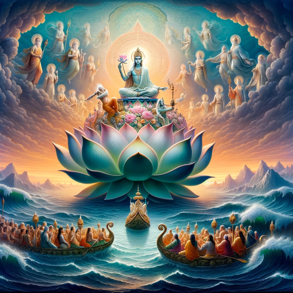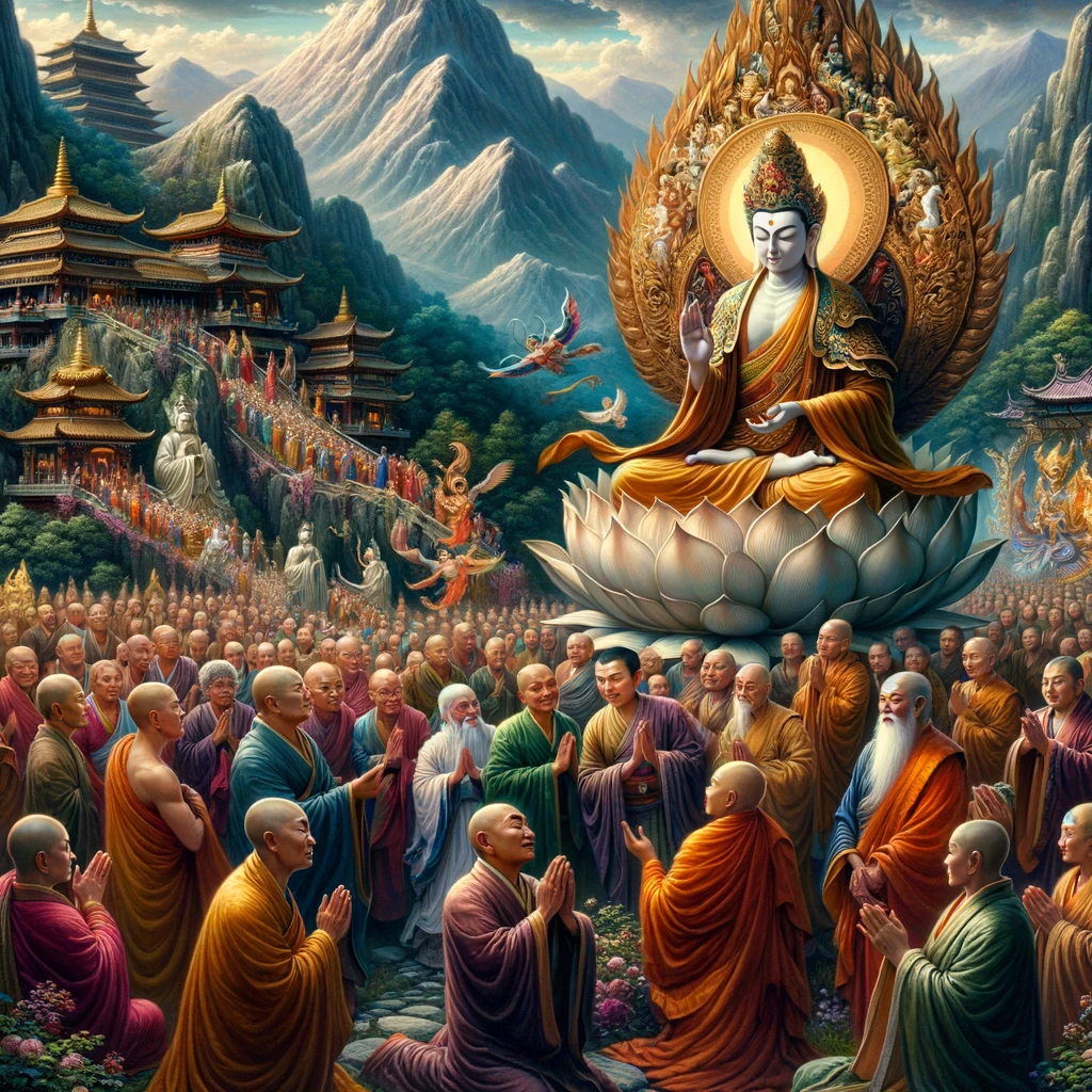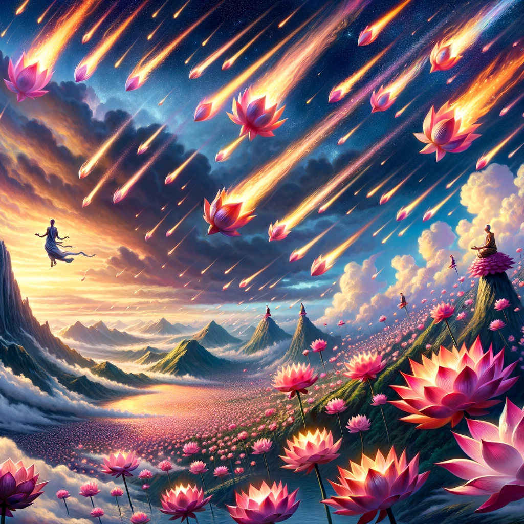 With these words, thousands of lotuses sprang from the sea to the sky, each bearing a spiritual seeker. They soared to Vulture Peak, looking like meteors. All had been guided by Mañjuśrī to the ultimate enlightenment. Among them, some praised the path of the great vehicle and the six perfect virtues, while others lauded the path of discipleship. But all recognized the emptiness of earthly things and the greatness of the spiritual path.