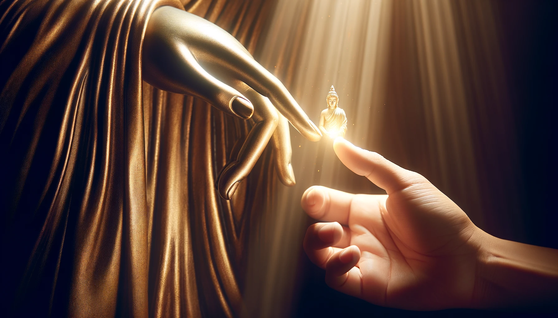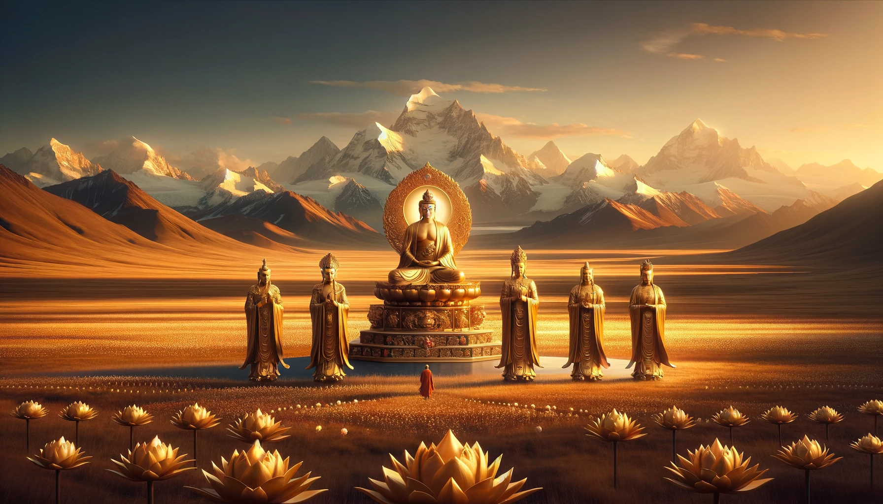 At that moment, other Tathāgatas (enlightened beings) who had come from countless worlds were present. These were creations of Lord Sākyamuni, and they were teaching the law to beings in other realms. Seated around Lord Sākyamuni on magnificent jewel thrones beneath jeweled trees in every direction, they too were filled with wonder at the sight of the immense gathering of Bodhisattvas emerging from the earth and filling the sky.