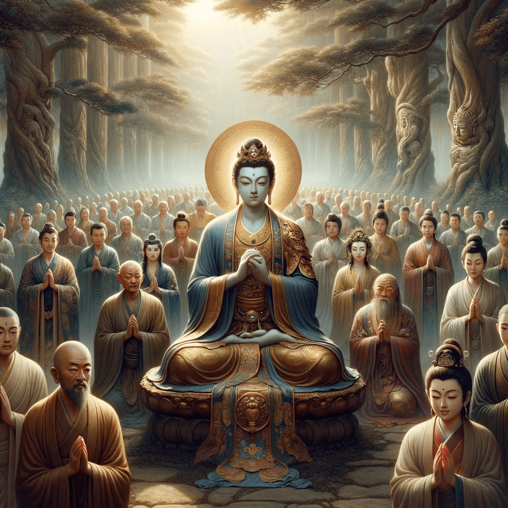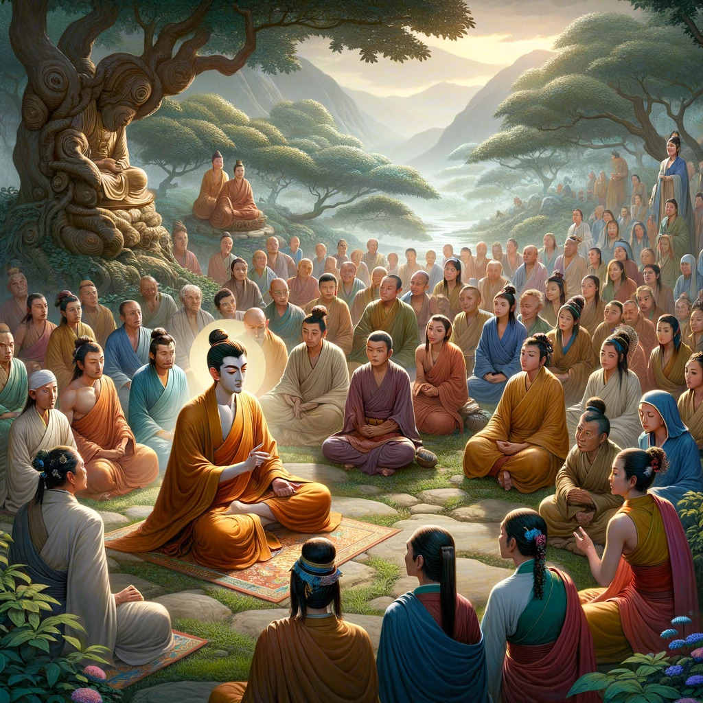 The Lord then spoke to the gathering of Bodhisattvas, saying: “Trust me, everyone of noble heart, believe in the truth that the Tathāgata (the Enlightened One) speaks.” Again, He addressed the Bodhisattvas, particularly the youth: “Trust me, young ones of noble heart, believe in the truth that the Tathāgata speaks.” And for the third and final time, He spoke to all present, including the women: “Trust me, everyone and ladies of noble heart, believe in the truth that the Tathāgata speaks.”