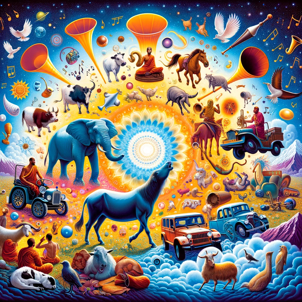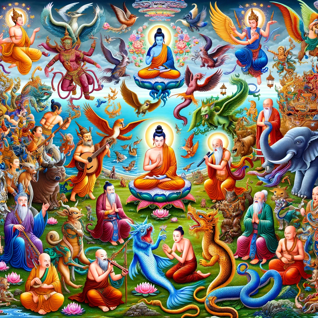 These sounds include those of horses, elephants, cows, peasants, goats, and vehicles; the cries of sorrow and fear; the sounds of conch trumpets, bells, and cymbals; the melodies of music and singing; the noises of camels and tigers; the voices of women, men, boys, girls; sounds associated with righteousness and unrighteousness, pleasure, and pain, wisdom, and ignorance; pleasing and displeasing noises; sounds from gods, mythical serpents, spirits, celestial musicians, demons, legendary birds, heavenly beings, great reptiles, humans, and non-human entities; the voices of monks, disciples, solitary enlightened ones, Bodhisattvas, and Enlightened Ones.