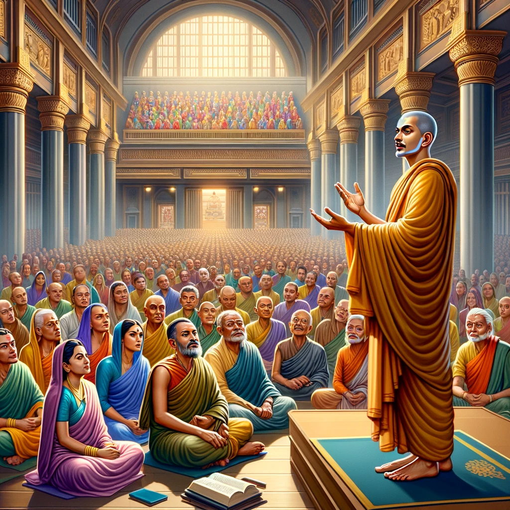 Everything he preaches, reflecting deeply on the interpretation of the law, will align with the truth; he will speak the words that all Tathagatas have spoken, echoing what has been declared in the Scriptures of previous Jinas (Victorious Ones).