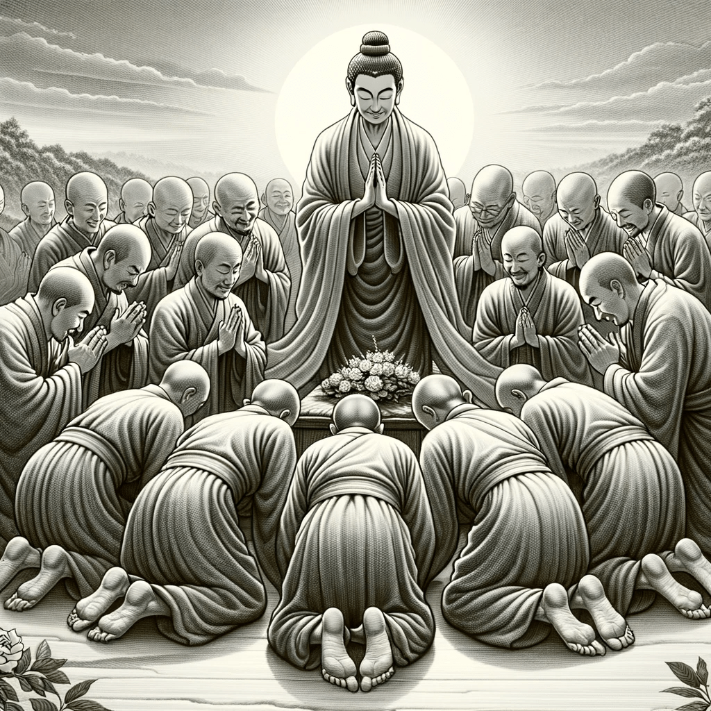 Hearing these words from the enlightened teacher Shakyamuni, the spiritual leaders were filled with joy and deep respect. They humbly bowed toward the master, their heads inclined, hands joined together, and spoke in unison: