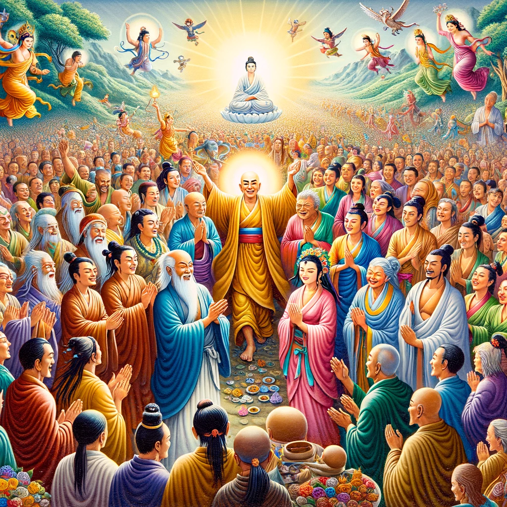 Along with the master’s closest followers, the diverse crowd of people, including gods, humans, and other mythical beings, all rejoiced and celebrated the words of the enlightened teacher, their hearts filled with joy and admiration.